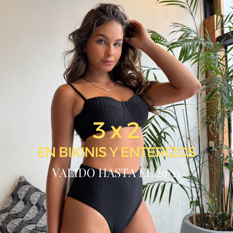 2 x 3 Agrega 3 prendas y paga 2 (se descuenta el producto de menor valor) de la sección Bikinis, Enterizos y Clothing,el descuento se verá reflejado al agregar los productos al carrito de compras No acumulables con otras promociones y/o descuentos.