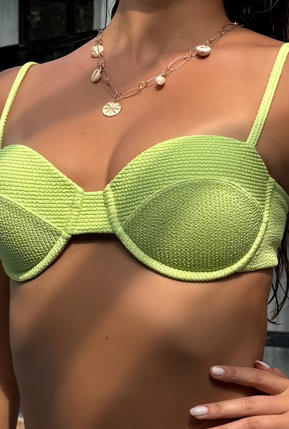 El top Bali es de licra con textura, lleva copas fijas y varillas curvas en la base para un mejor realce, además lleva tiras en los hombros con reguladores y el contorno del tórax es para amarrar. Tabla de medidas