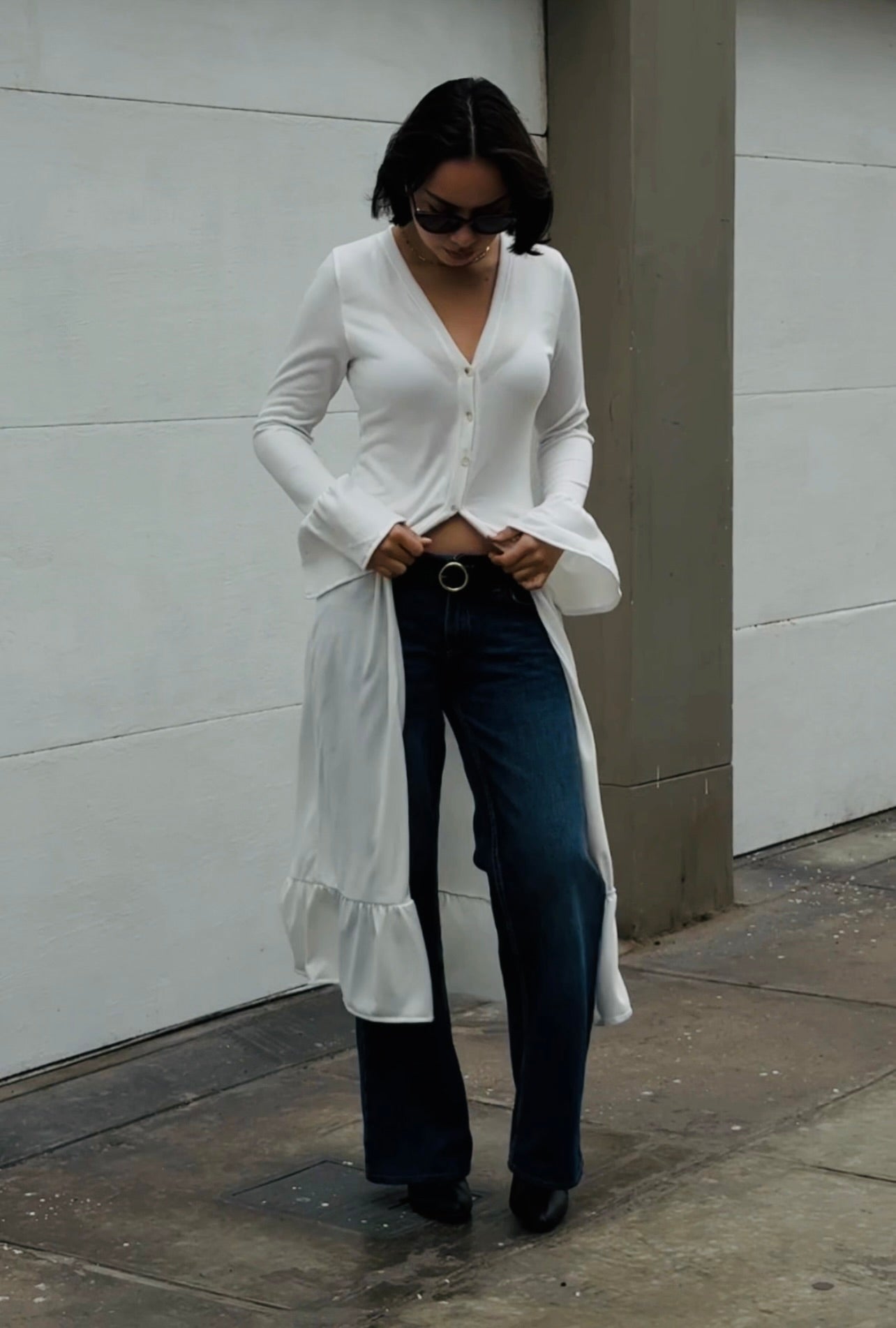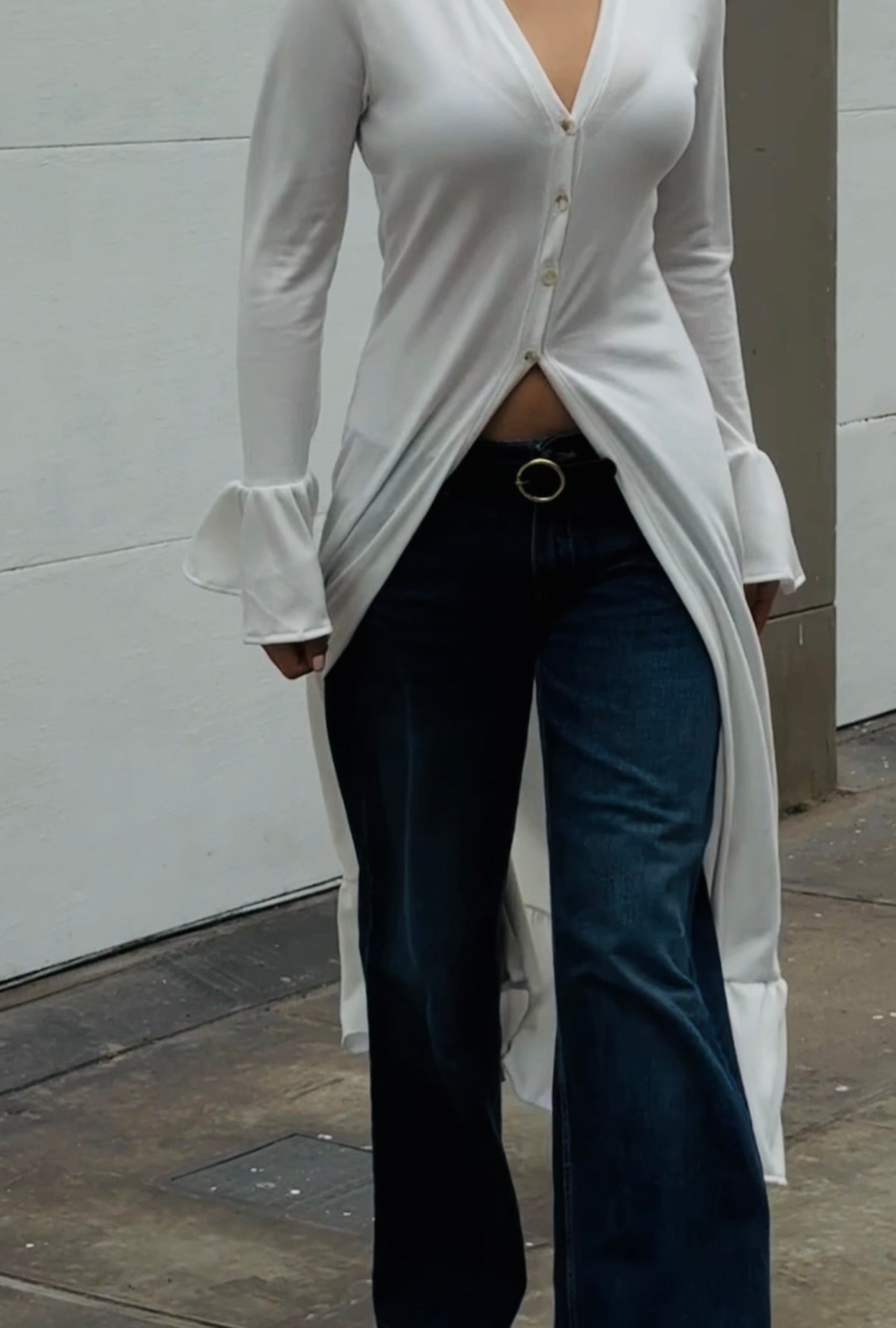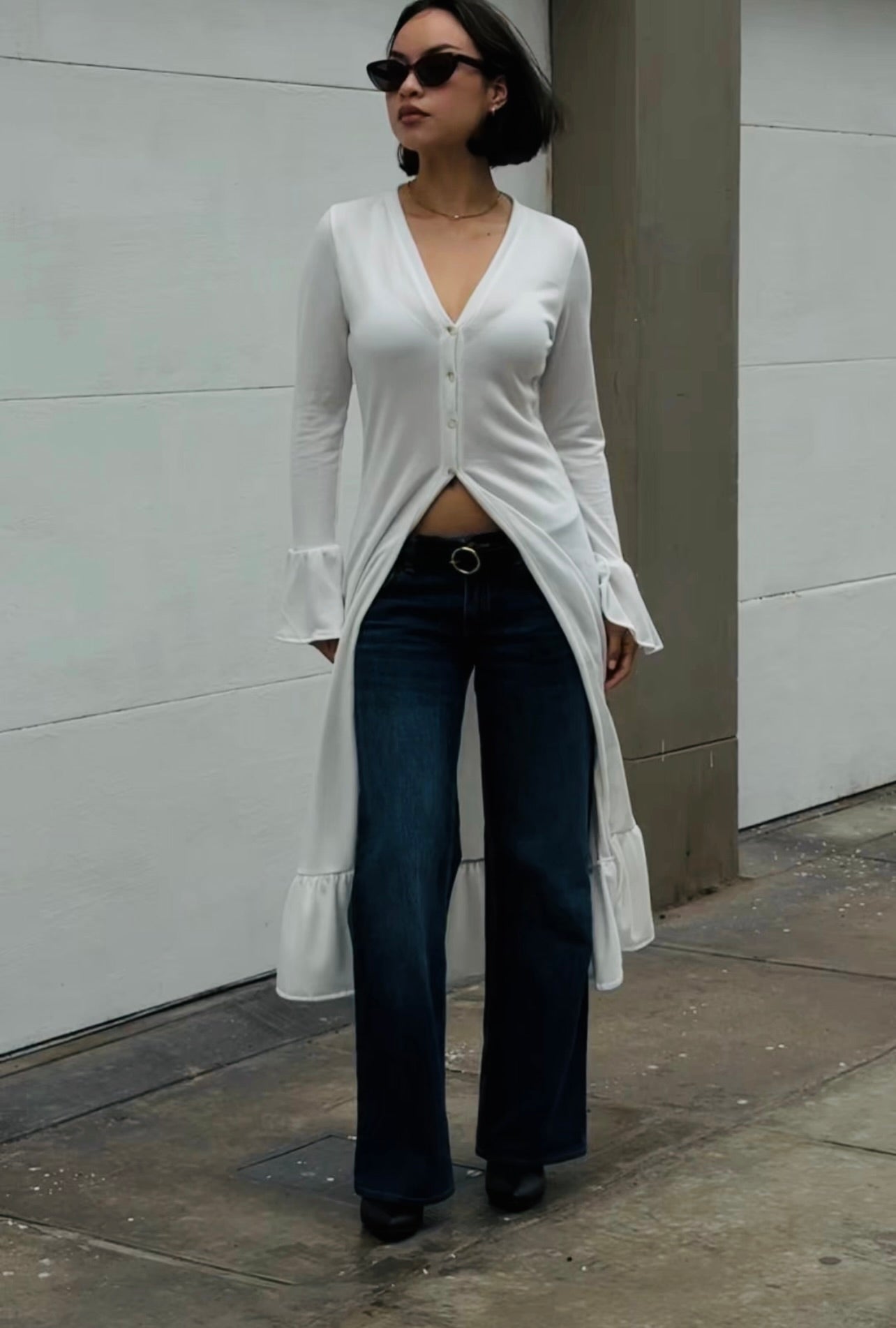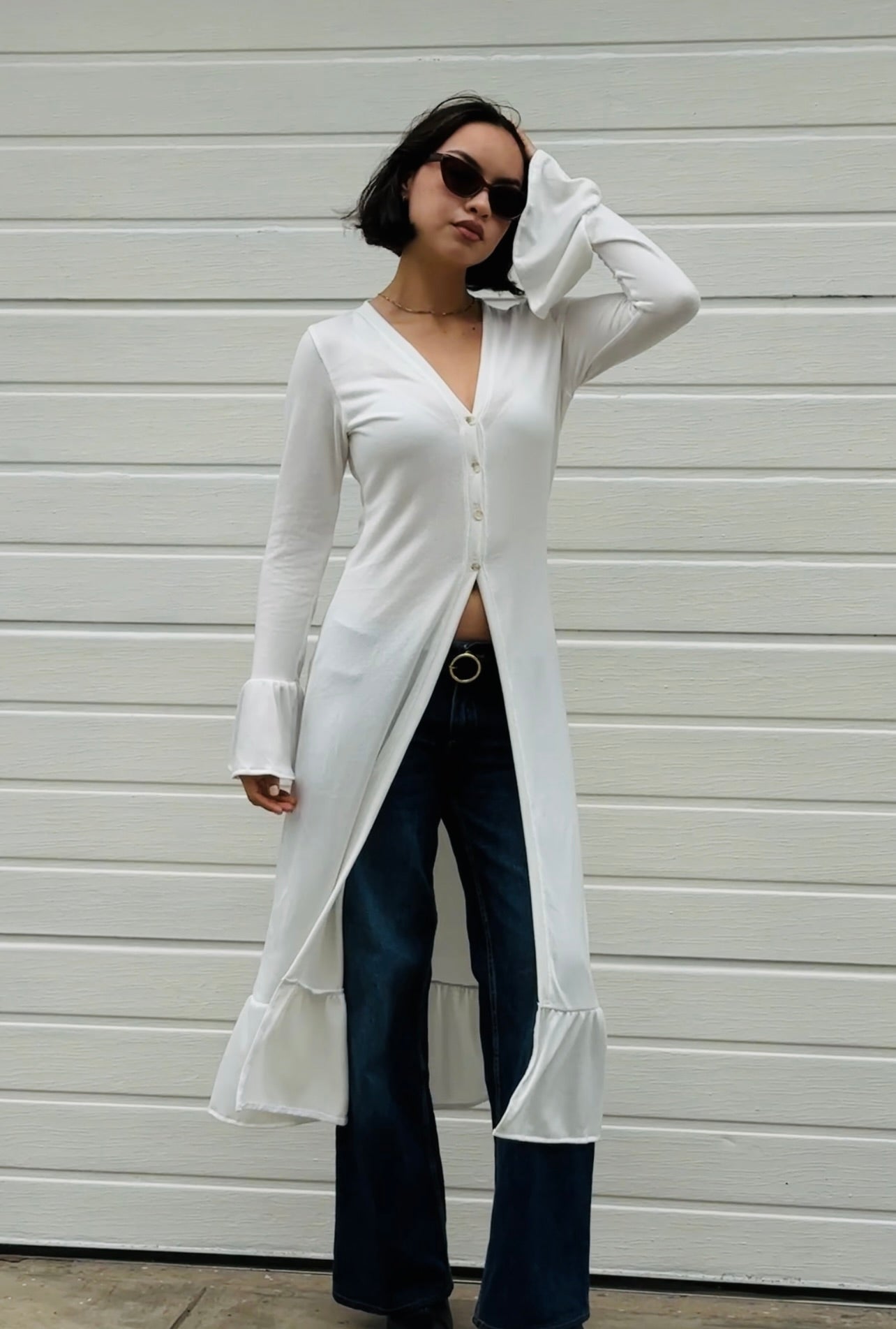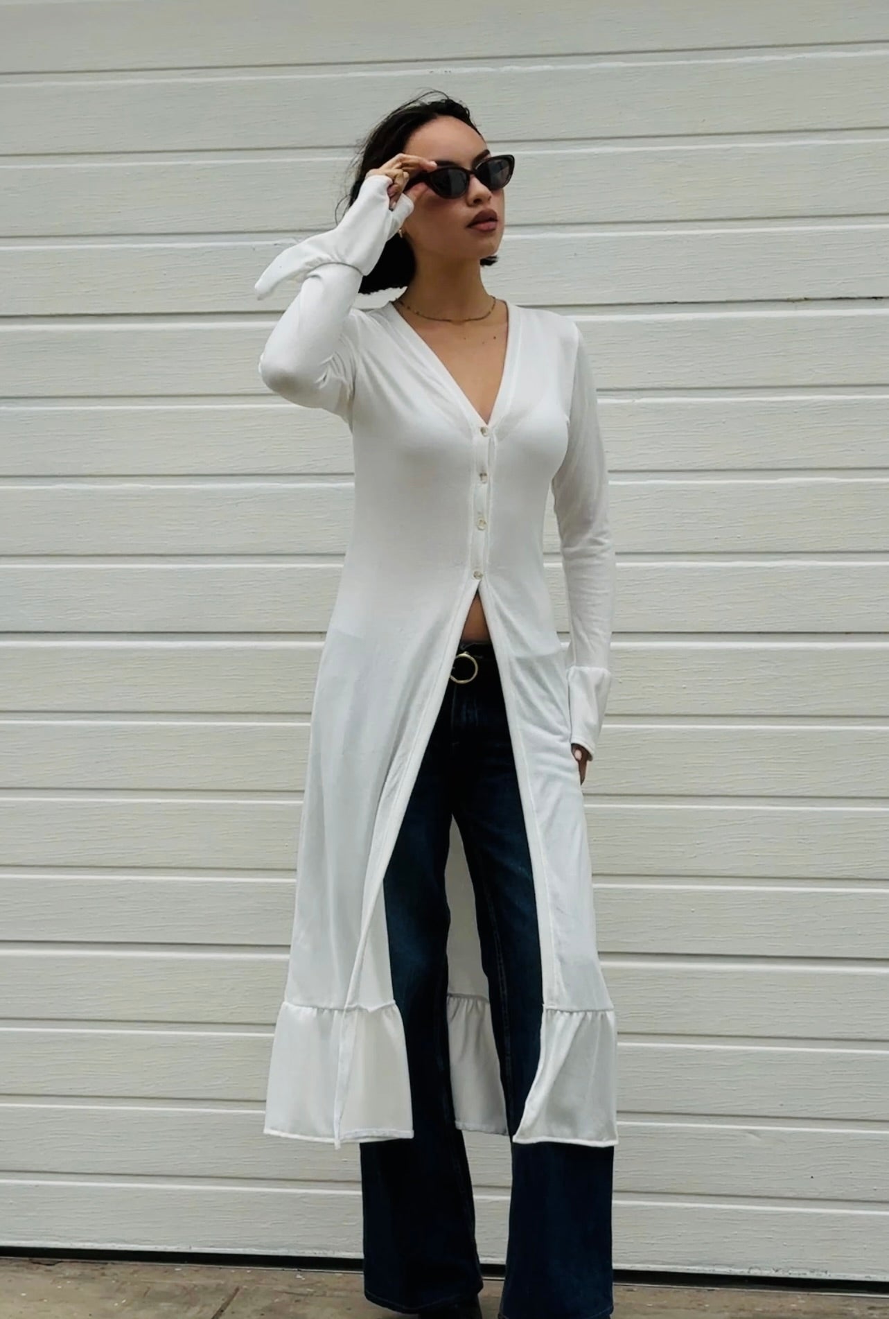 El cádigan Mia es largo midi , lleva botones en el delantero hasta la altura de la cintura . Es un modelo funcional , lo puedes usar solo ó con un top dentro. Esta hecha de angora americana ( chompero delgado)