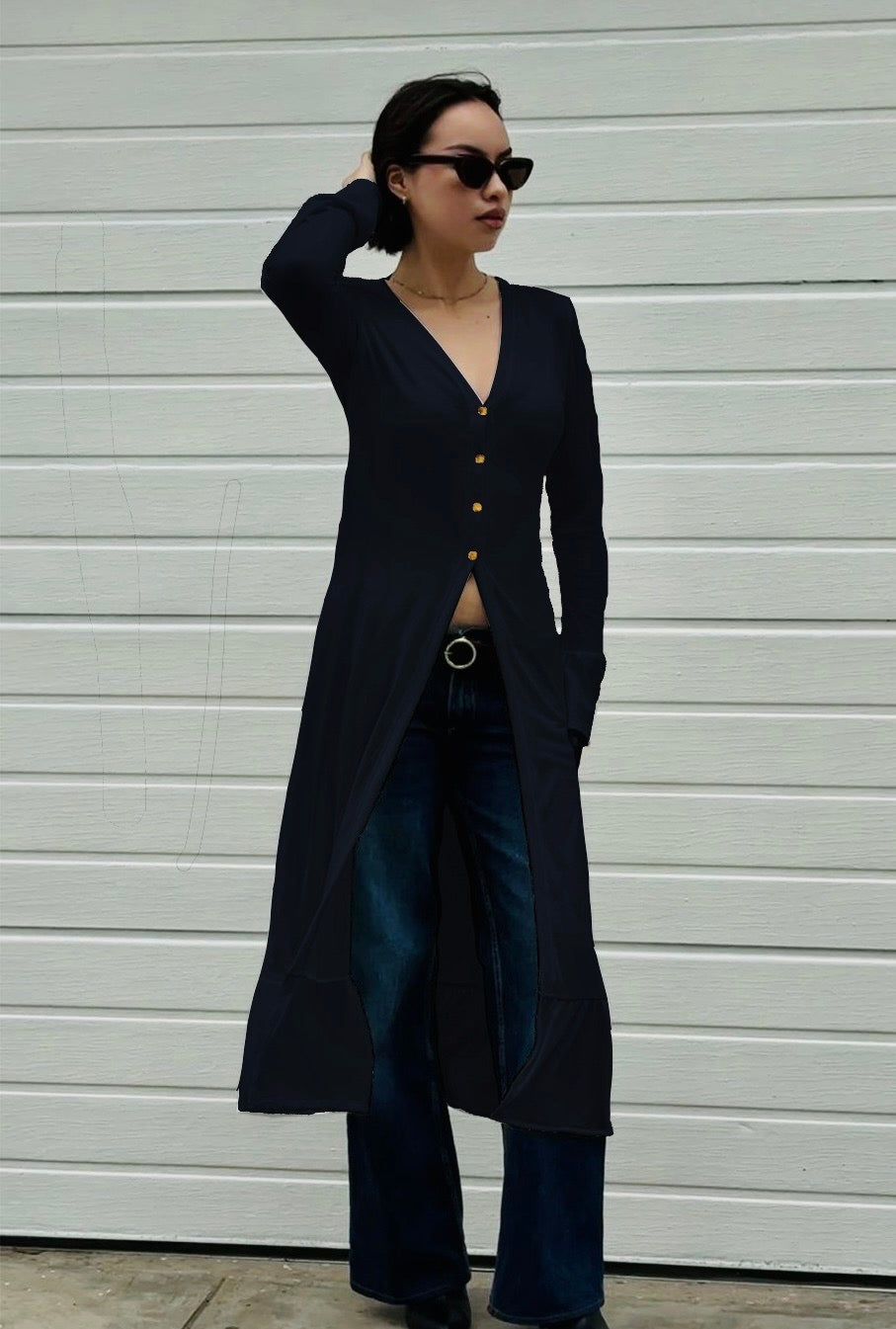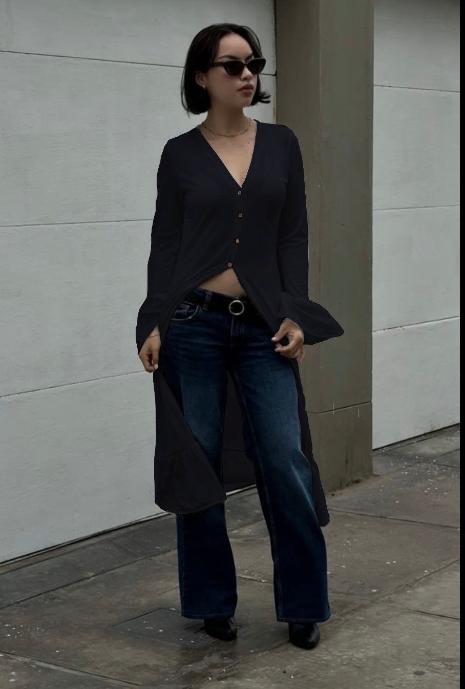 El cádigan Mia es largo midi , lleva botones en el delantero hasta la altura de la cintura . Es un modelo funcional , lo puedes usar solo ó con un top dentro. Esta hecha de angora americana ( chompero delgado)