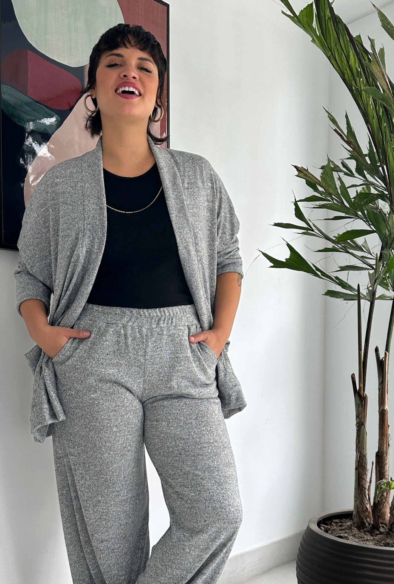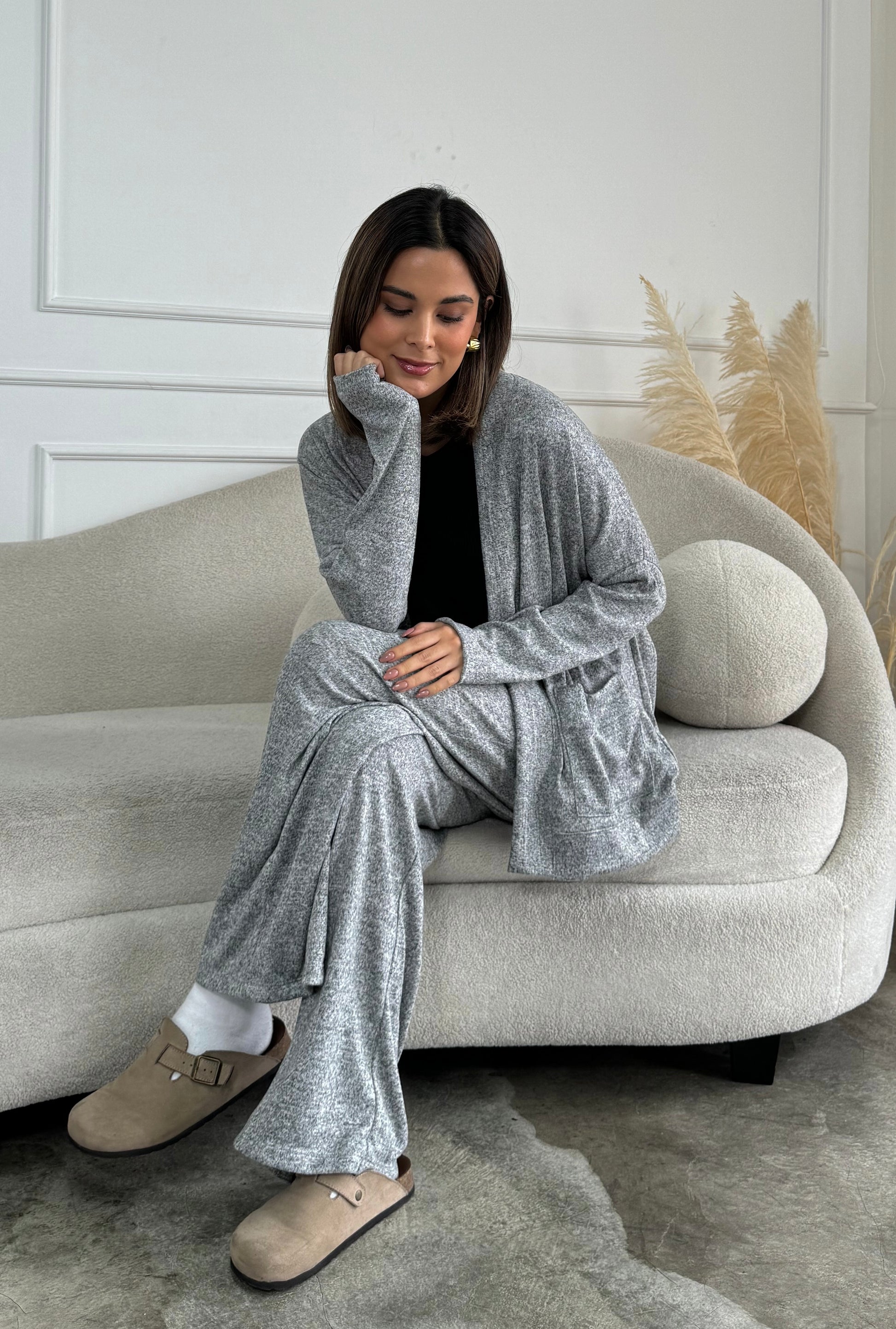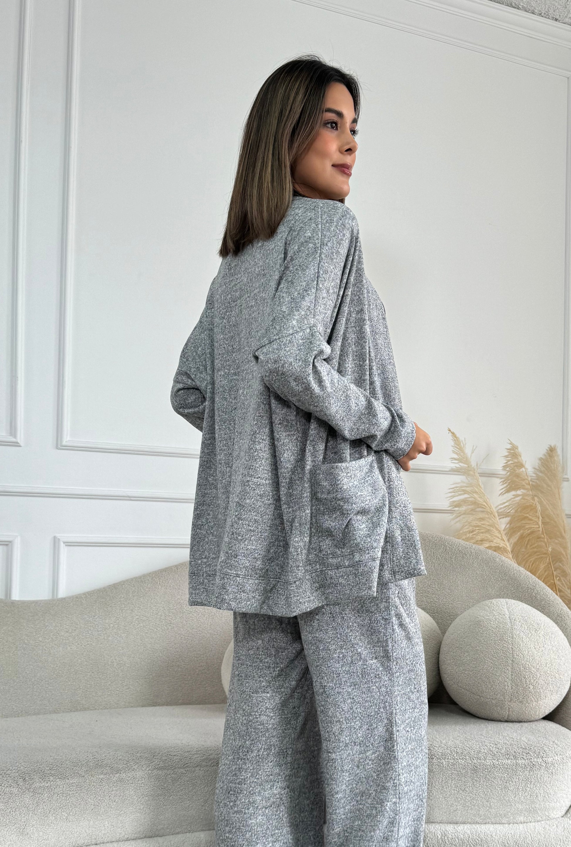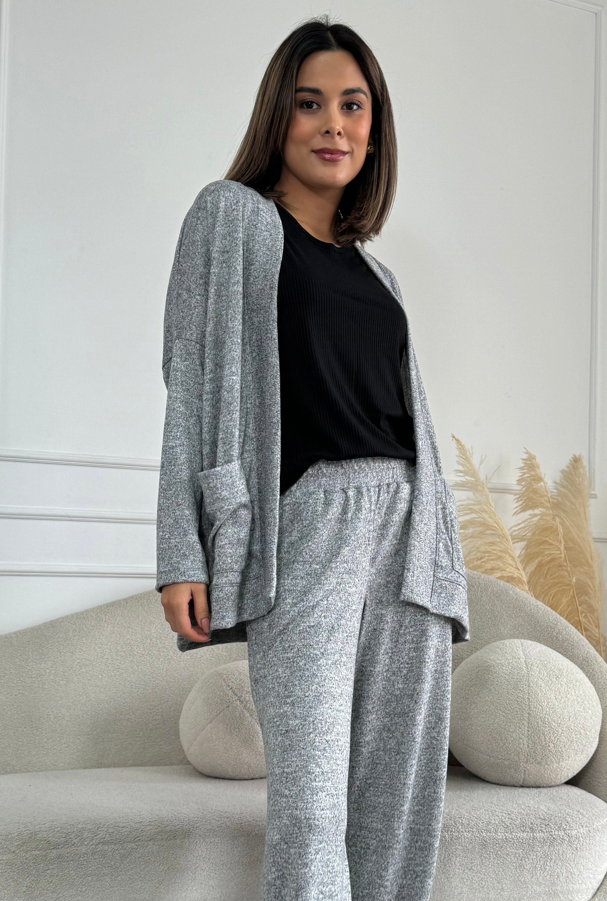 Nuestro conjunto Ariana color plomo jaspeado es de tela chompero liviano, suave al tacto en 95% poliéster y 5% spandex. El cardigan tiene manga larga y lleva bolsillos a los lados tipo parche. El pantalón lleva elástico en la pretina y bolsillos a los lados. Este es un modelo cómodo al ser holgado.