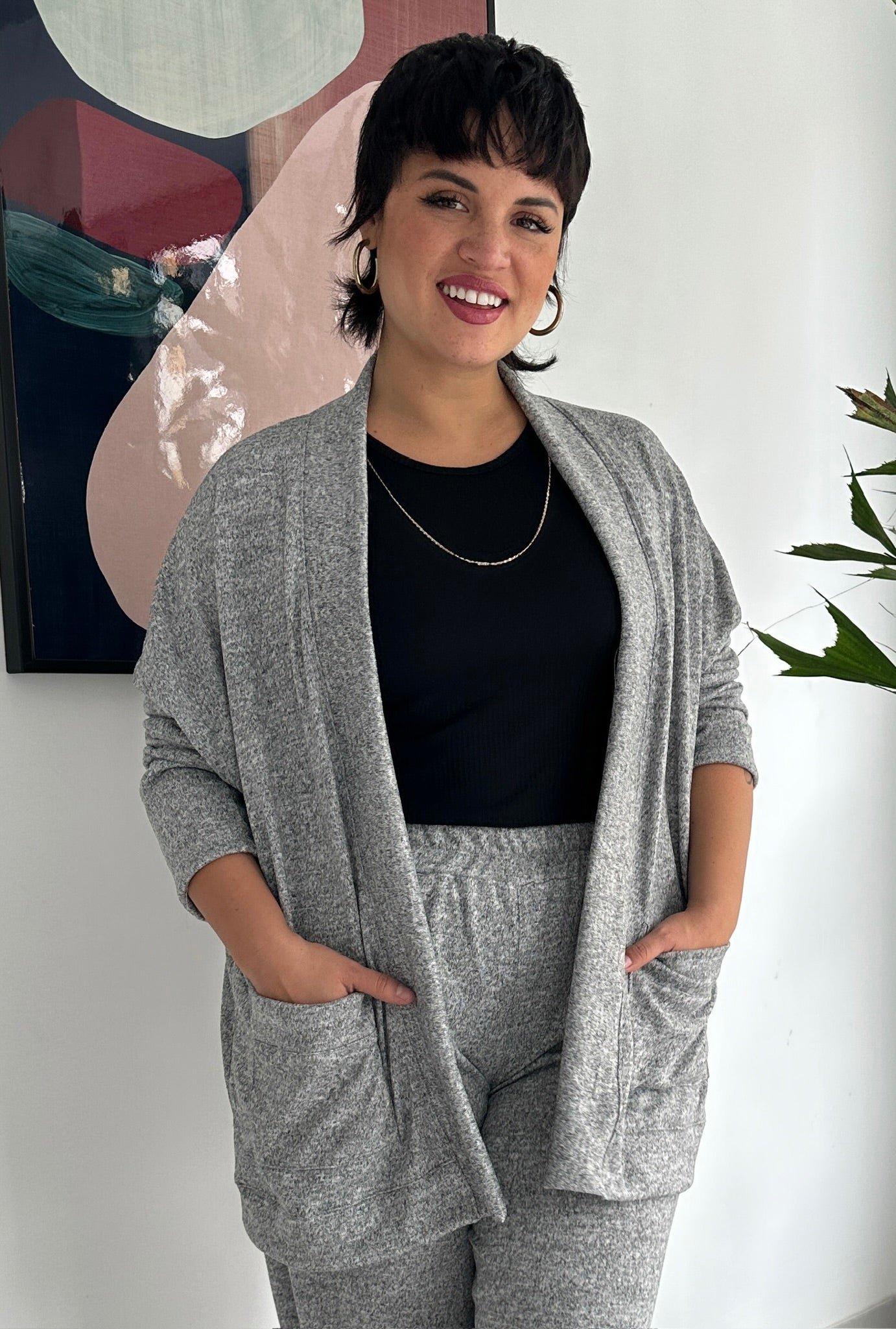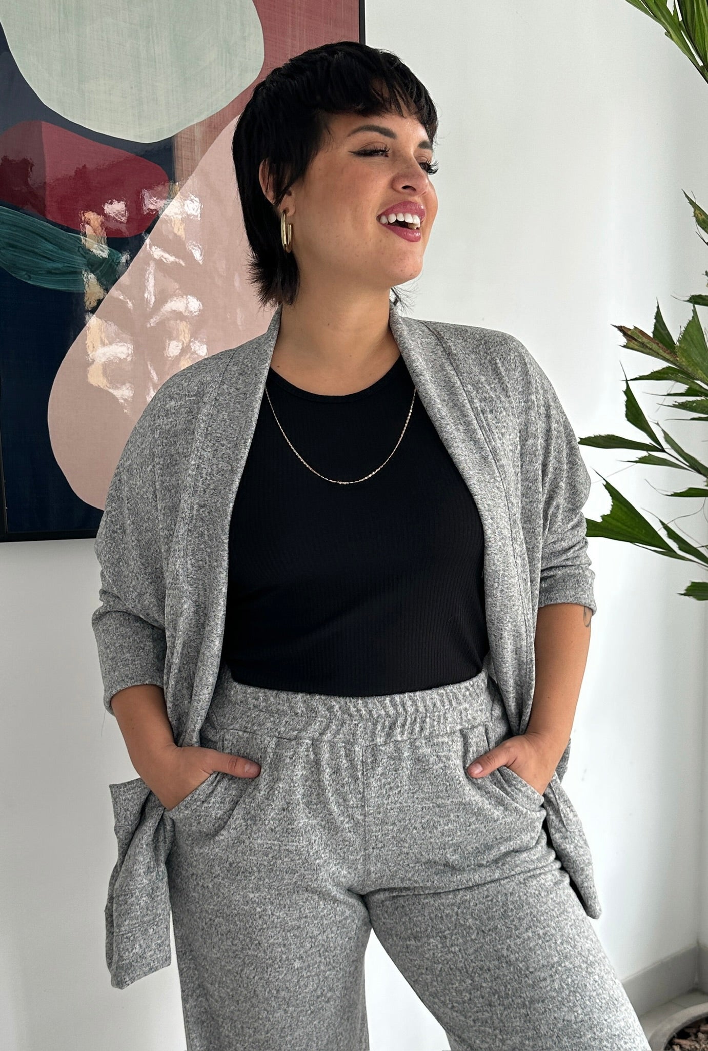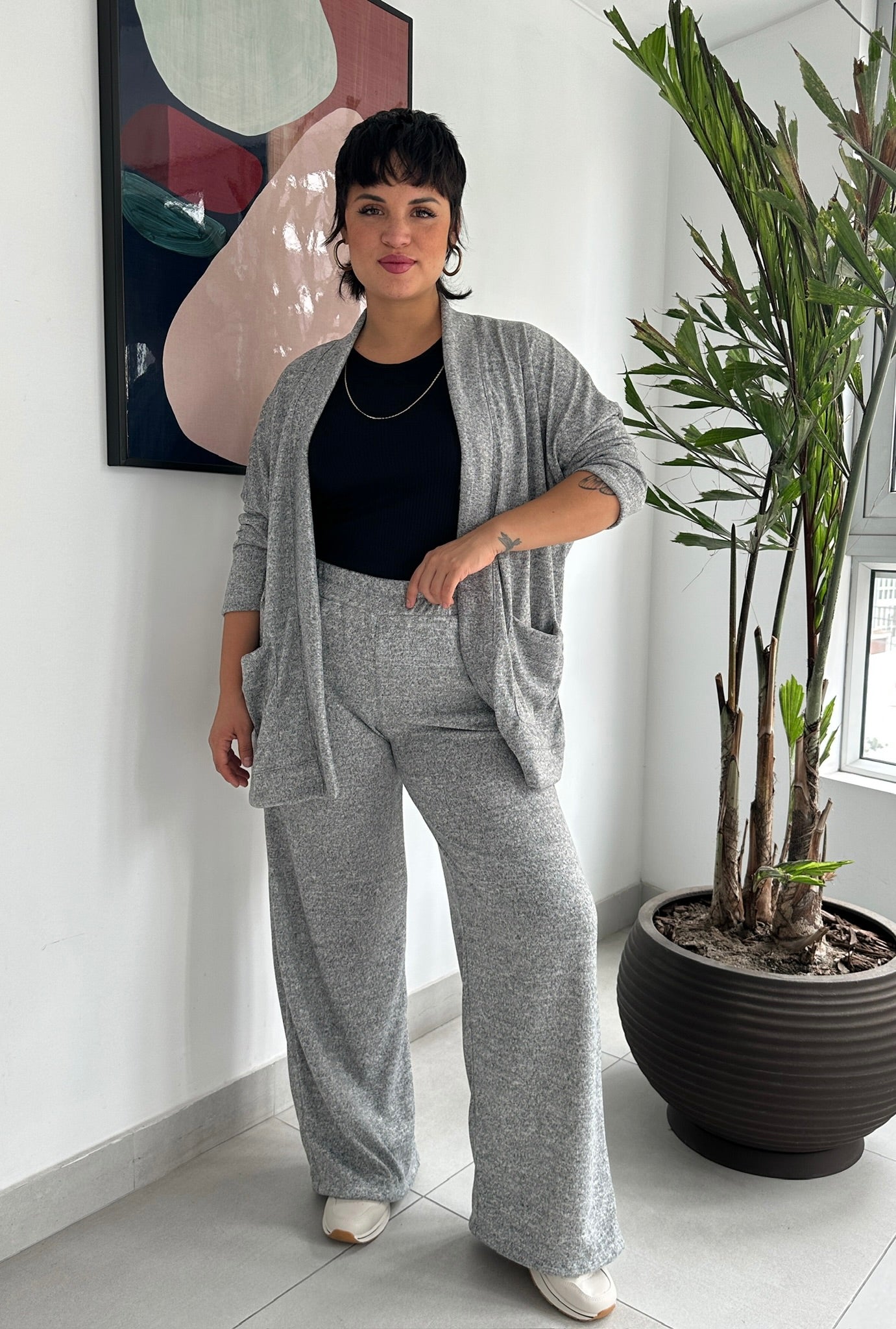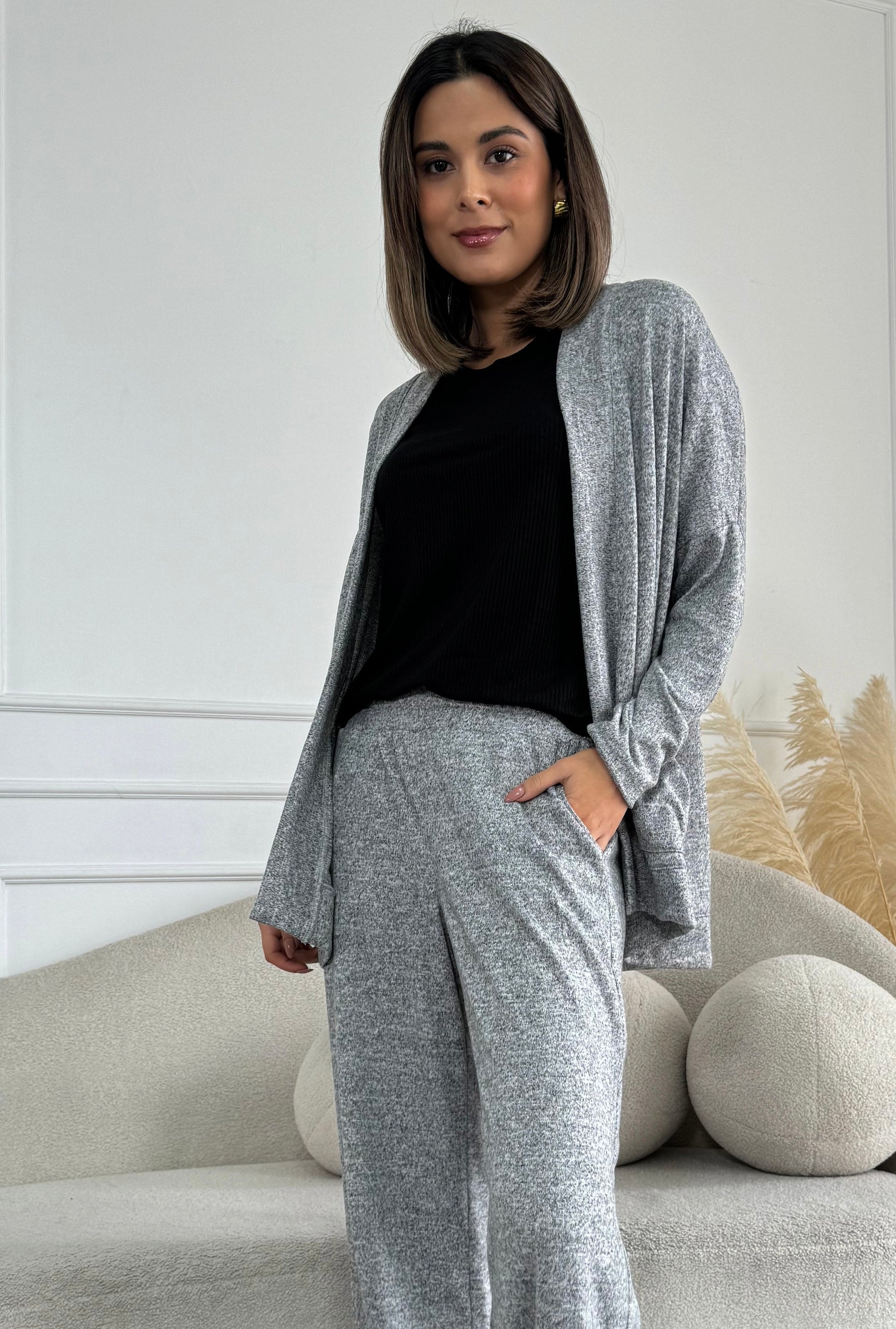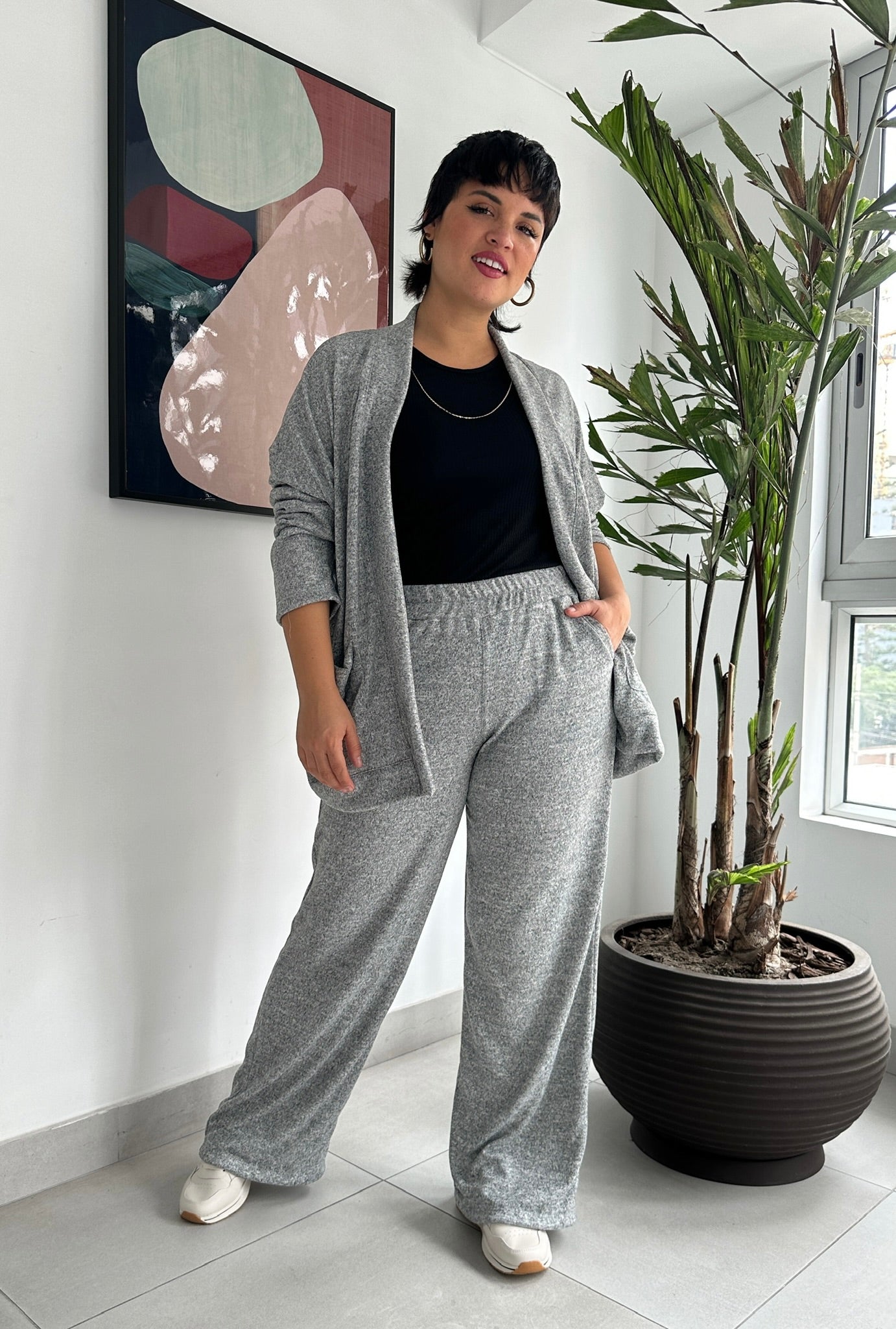 Nuestro conjunto Ariana color plomo jaspeado es de tela chompero liviano, suave al tacto en 95% poliéster y 5% spandex. El cardigan tiene manga larga y lleva bolsillos a los lados tipo parche. El pantalón lleva elástico en la pretina y bolsillos a los lados. Este es un modelo cómodo al ser holgado.