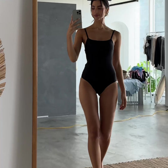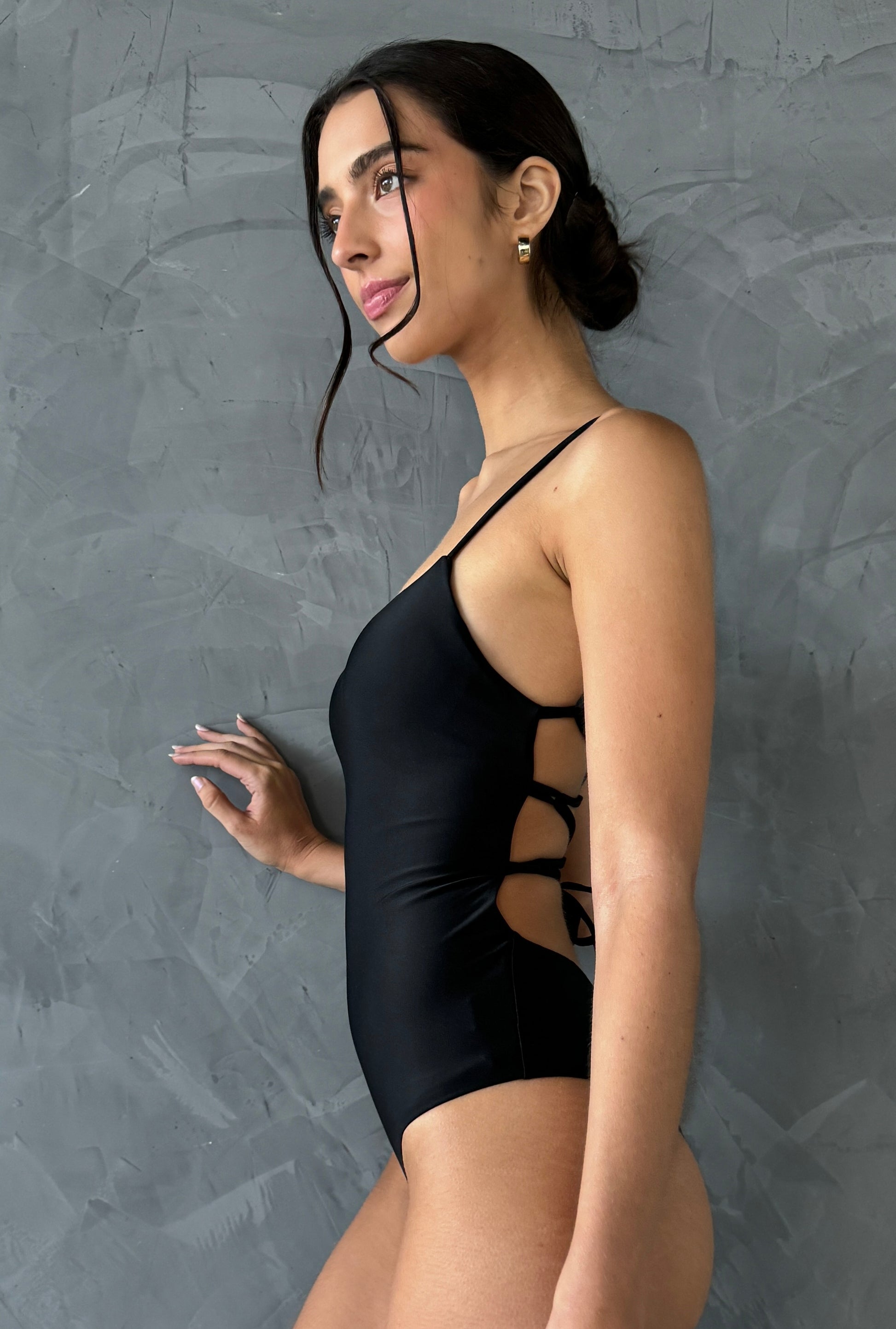 Ropa de baño de una sola pieza lleva el escote recto, tiras largas que cruzan en la espalda , proporciona al modelo un ajuste favorecedor .