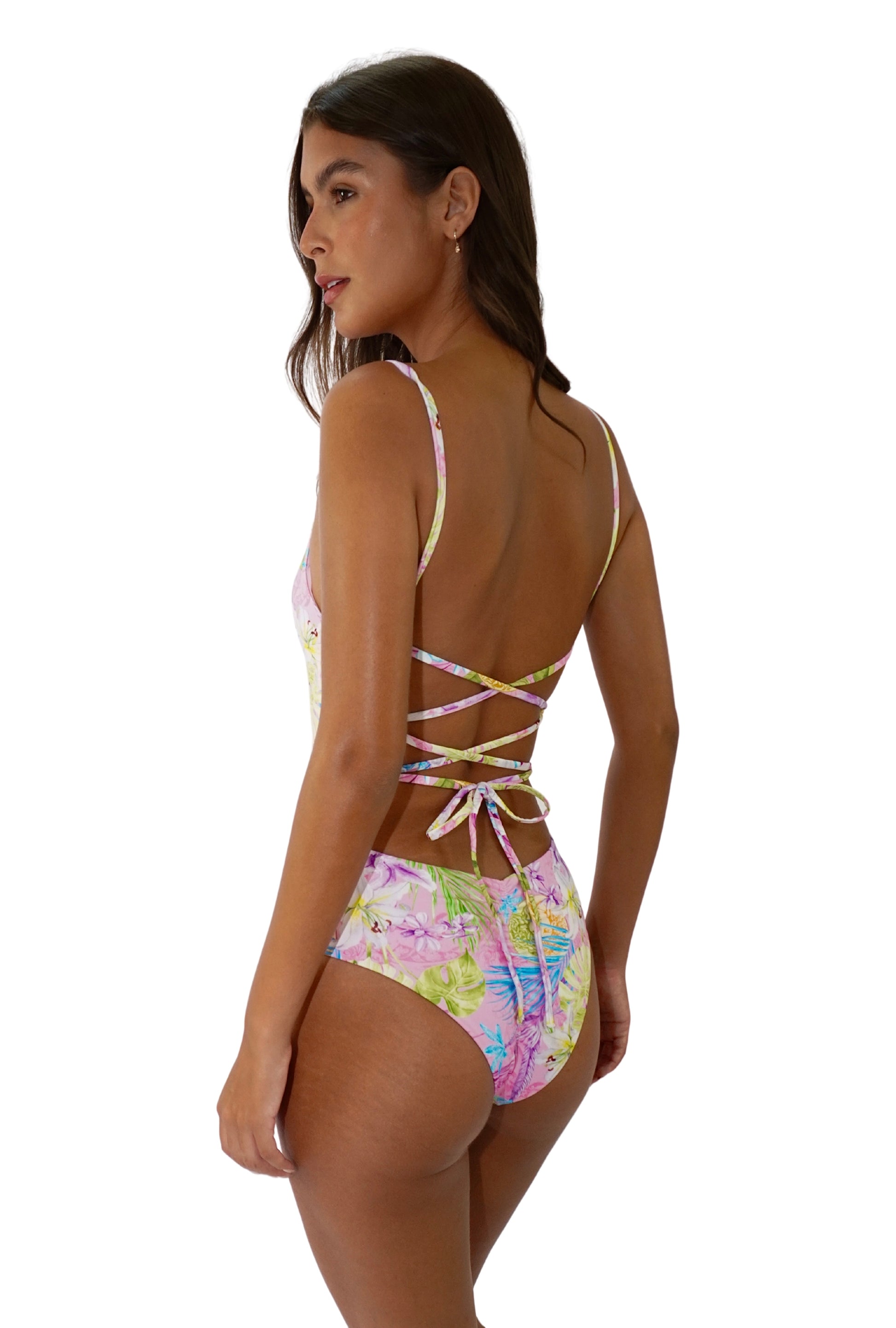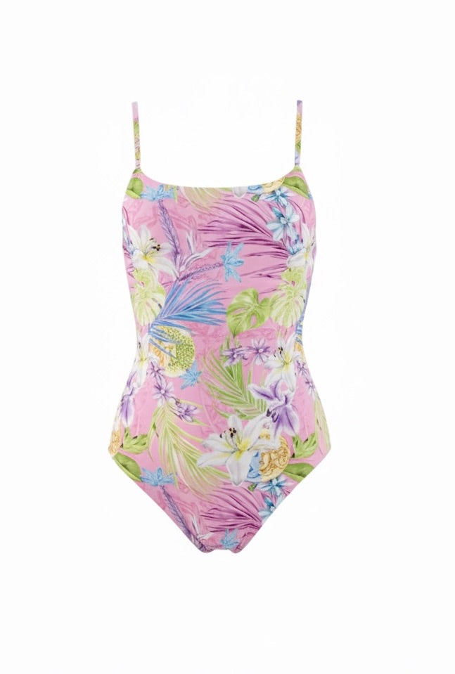 Ropa de baño de una sola pieza en estampado flores rosadas, este es un modelo favorecedor para todas las siluetas y cómodo al usar. Tiene pitas cruzadas para regular en la espalda y copas removibles que puedes retirar y colocar cuando quieras. Además, es de calce brasileña.