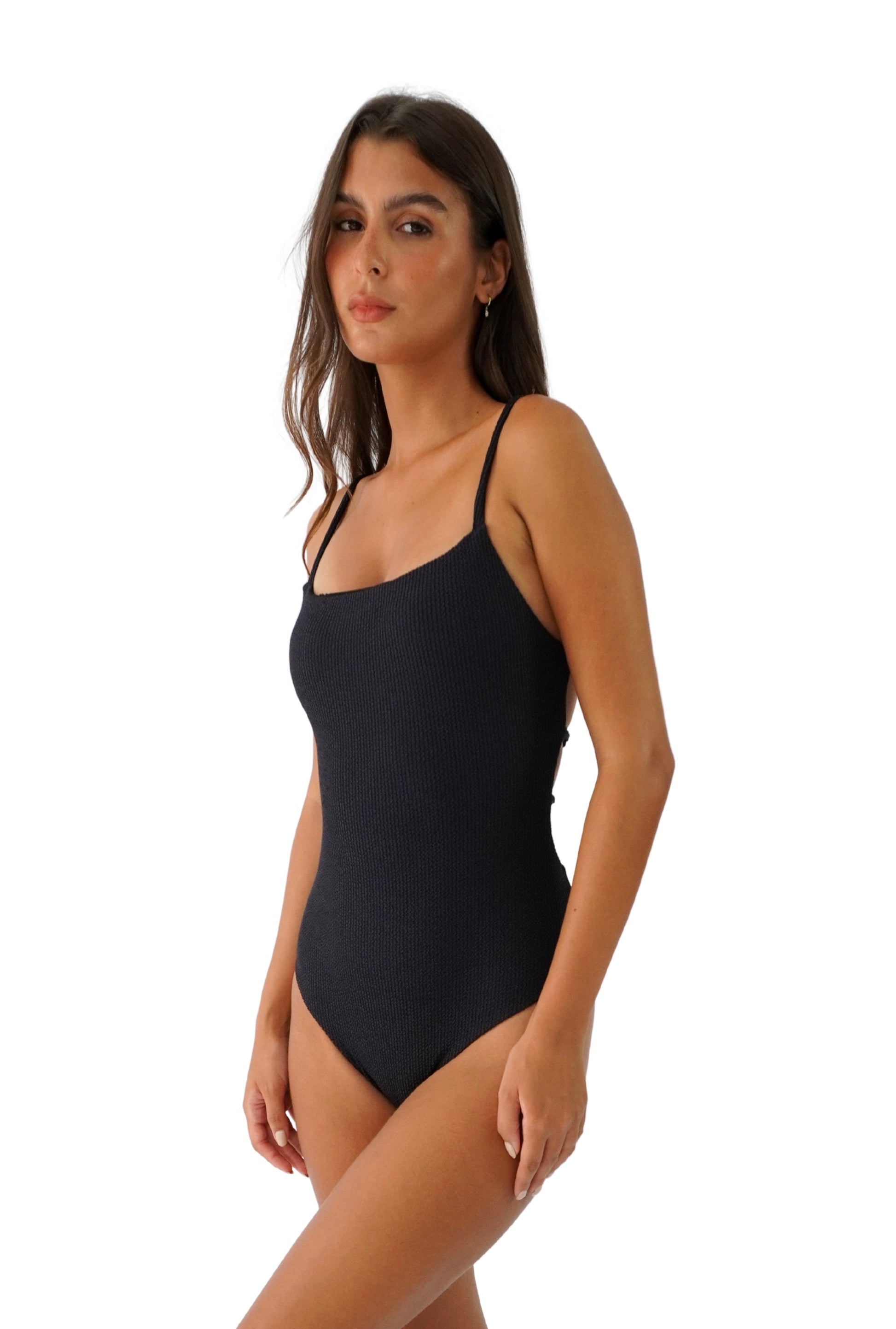Ropa de baño de una sola pieza lleva el escote recto, tiras largas que cruzan en la espalda , lo que hace al modelo regulable.