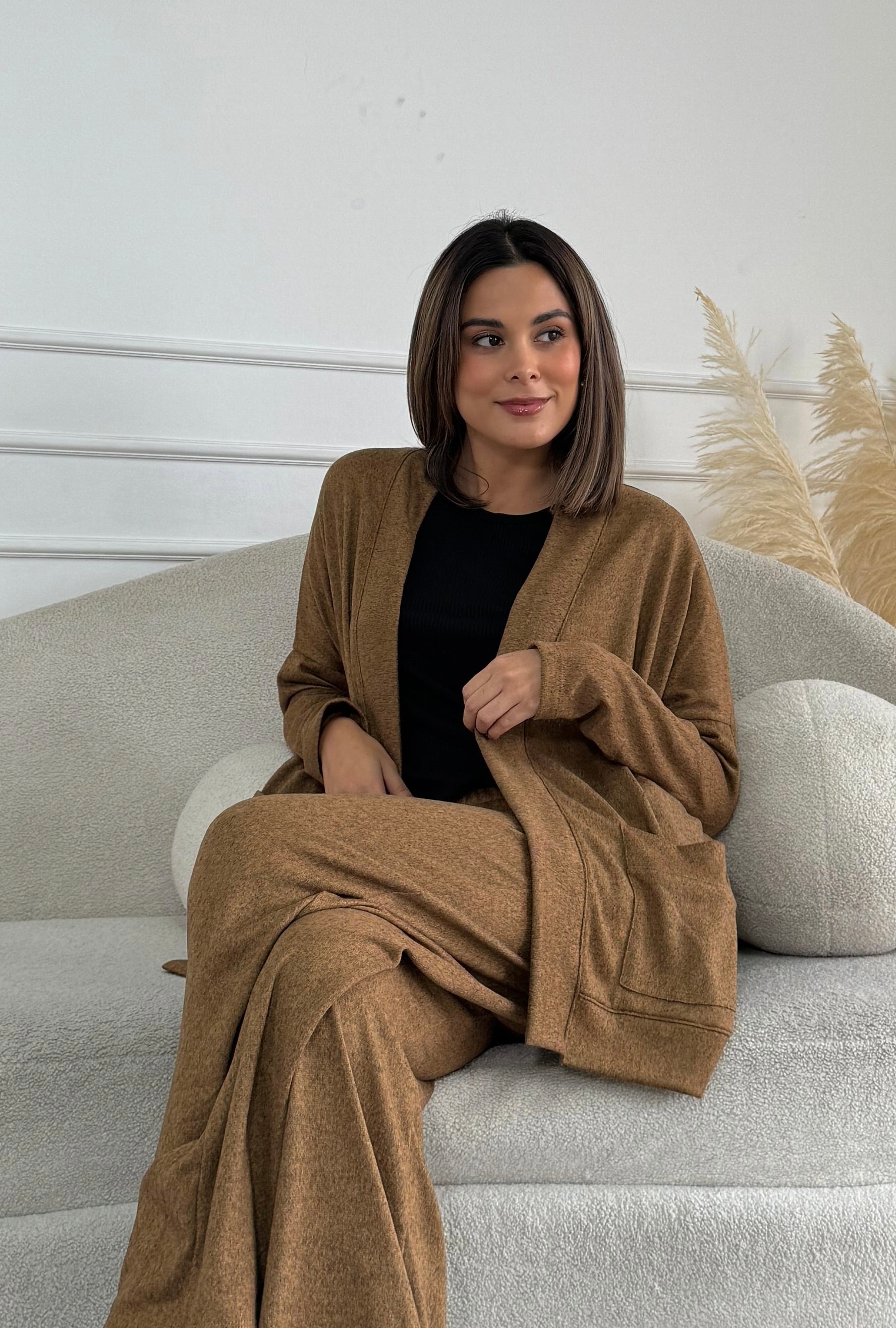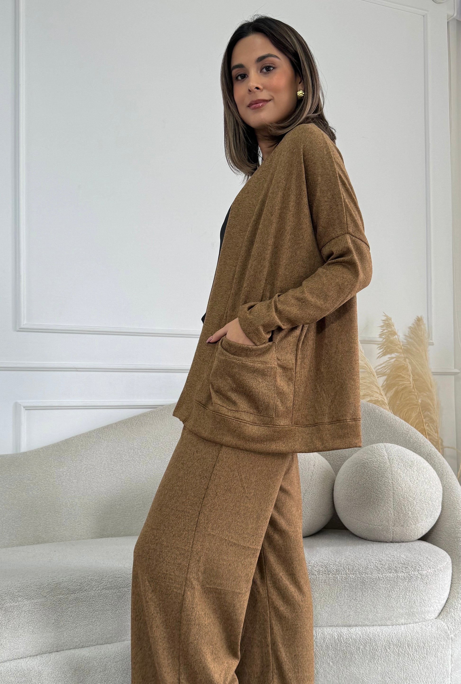 Nuestro cardigan Ariana color camel jaspeado es de tela chompero liviano, suave al tacto en 95% poliéster y 5% spandex. El cardigan tiene manga larga y lleva bolsillos a los lados tipo parche. El pantalón lleva elástico en la pretina y bolsillos a los lados. Este es un modelo cómodo al ser holgado.