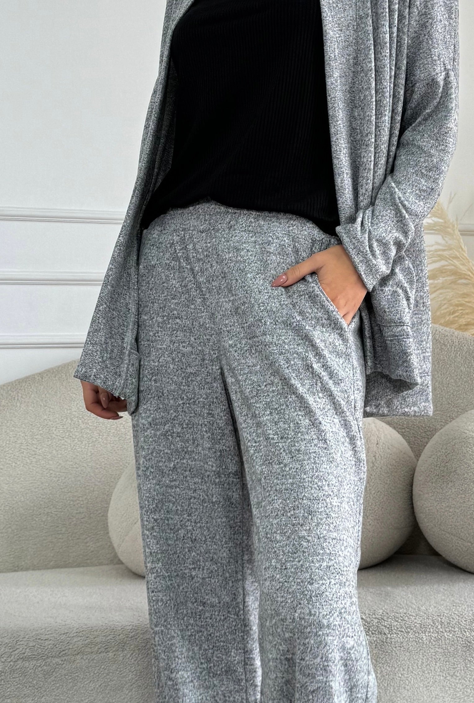 Nuestro pantalón Ariana color plomo jaspeado es de tela chompero liviano, suave al tacto en 95% poliéster y 5% spandex. El cardigan tiene manga larga y lleva bolsillos a los lados tipo parche. El pantalón lleva elástico en la pretina y bolsillos a los lados. Este es un modelo cómodo al ser holgado.