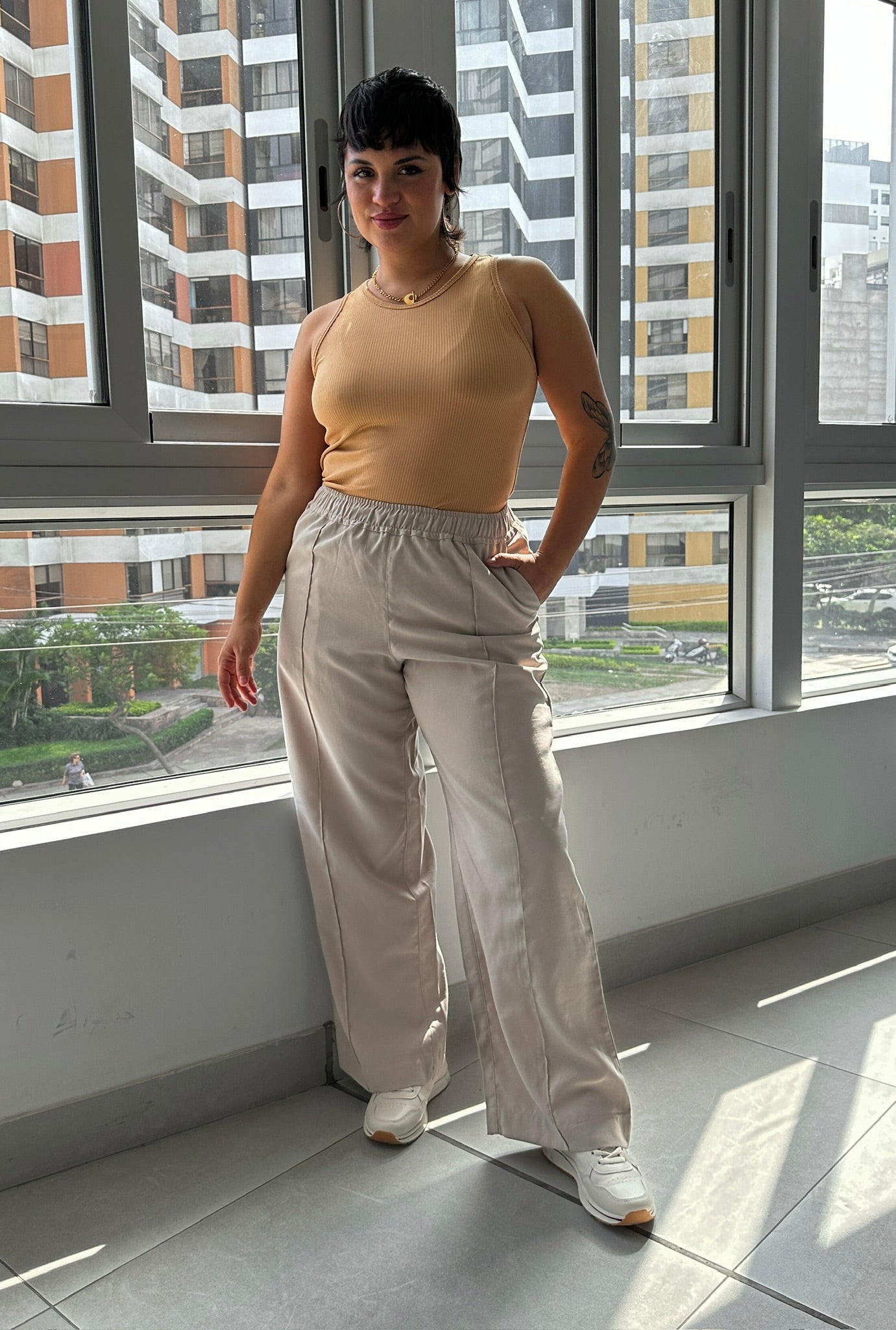 La modelo mide 1.68 cm y esta usando talla estandar.
