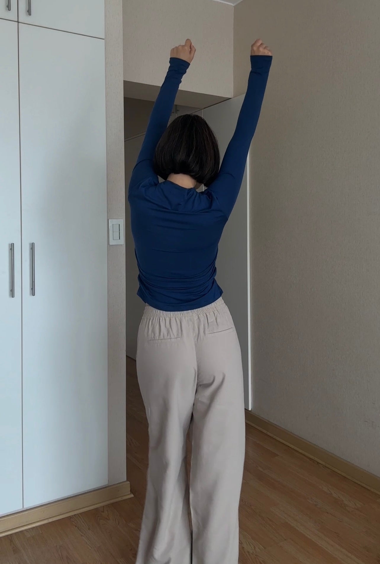Top en viscosa color azul, tiene cuello alto y es manga larga. Lleva corrugado a la altura de la cintura.