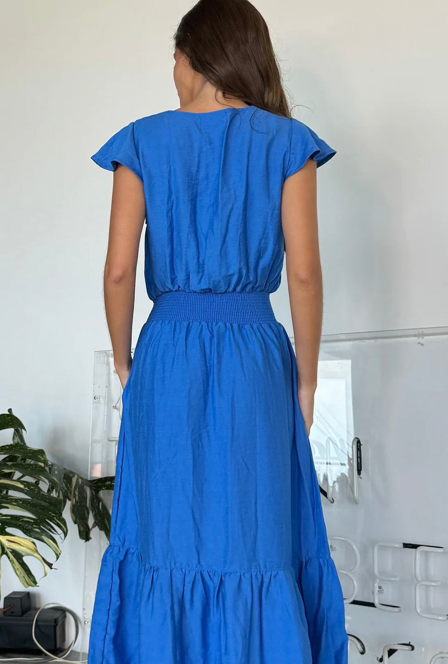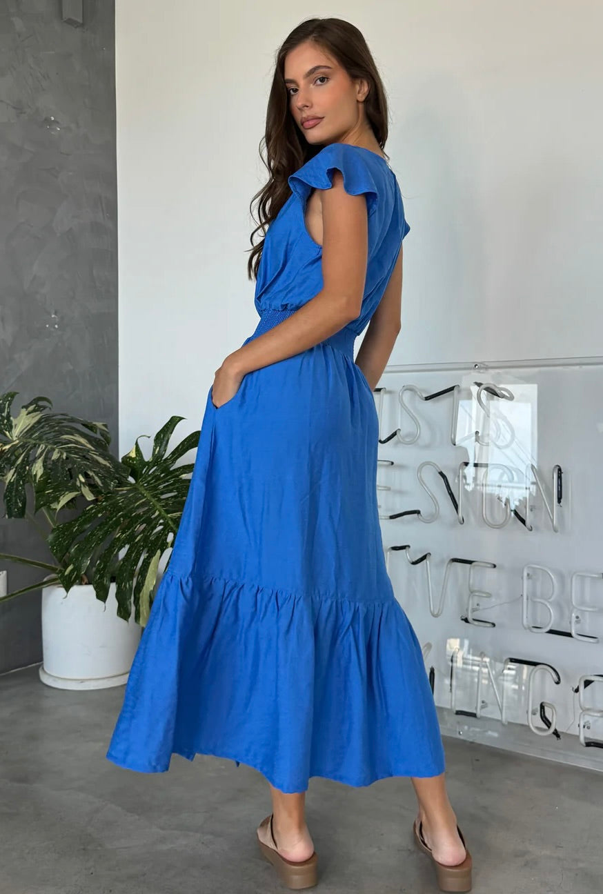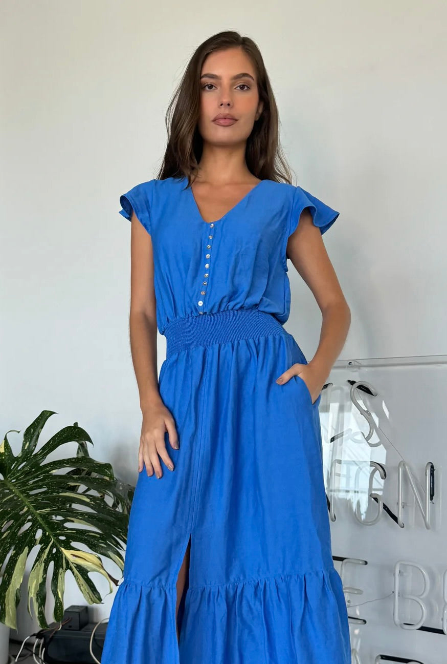 Vestido de largo midi en lino americano color azulino. Es un modelo cómodo y ligero, lleva bolsillo a los costados. La tela es efecto airflow (efecto arrugado) de tacto suave y buena caída.