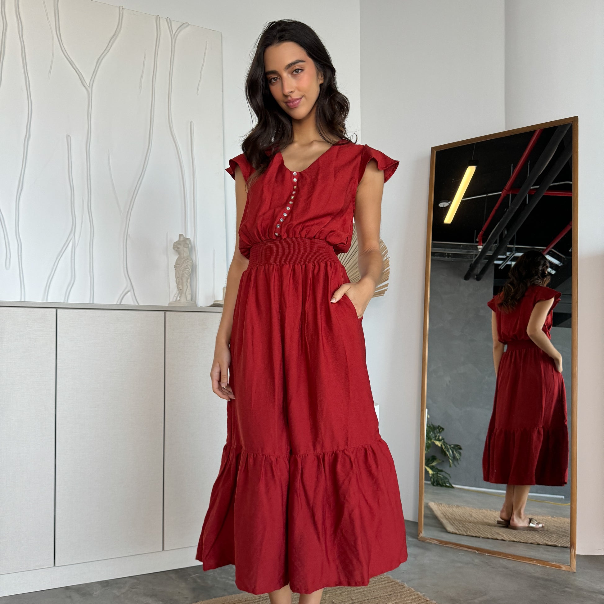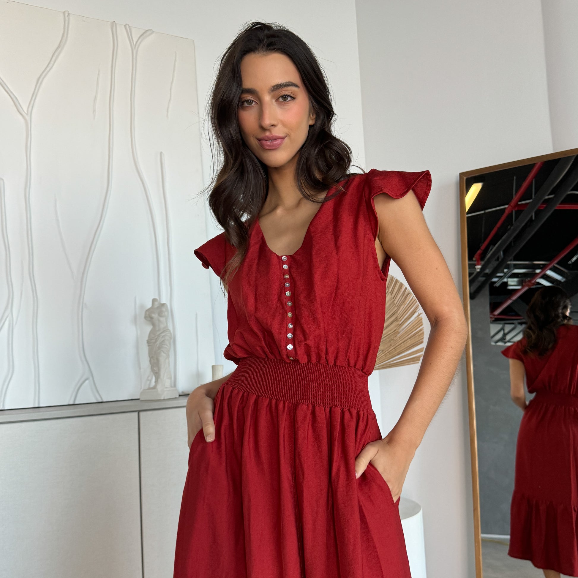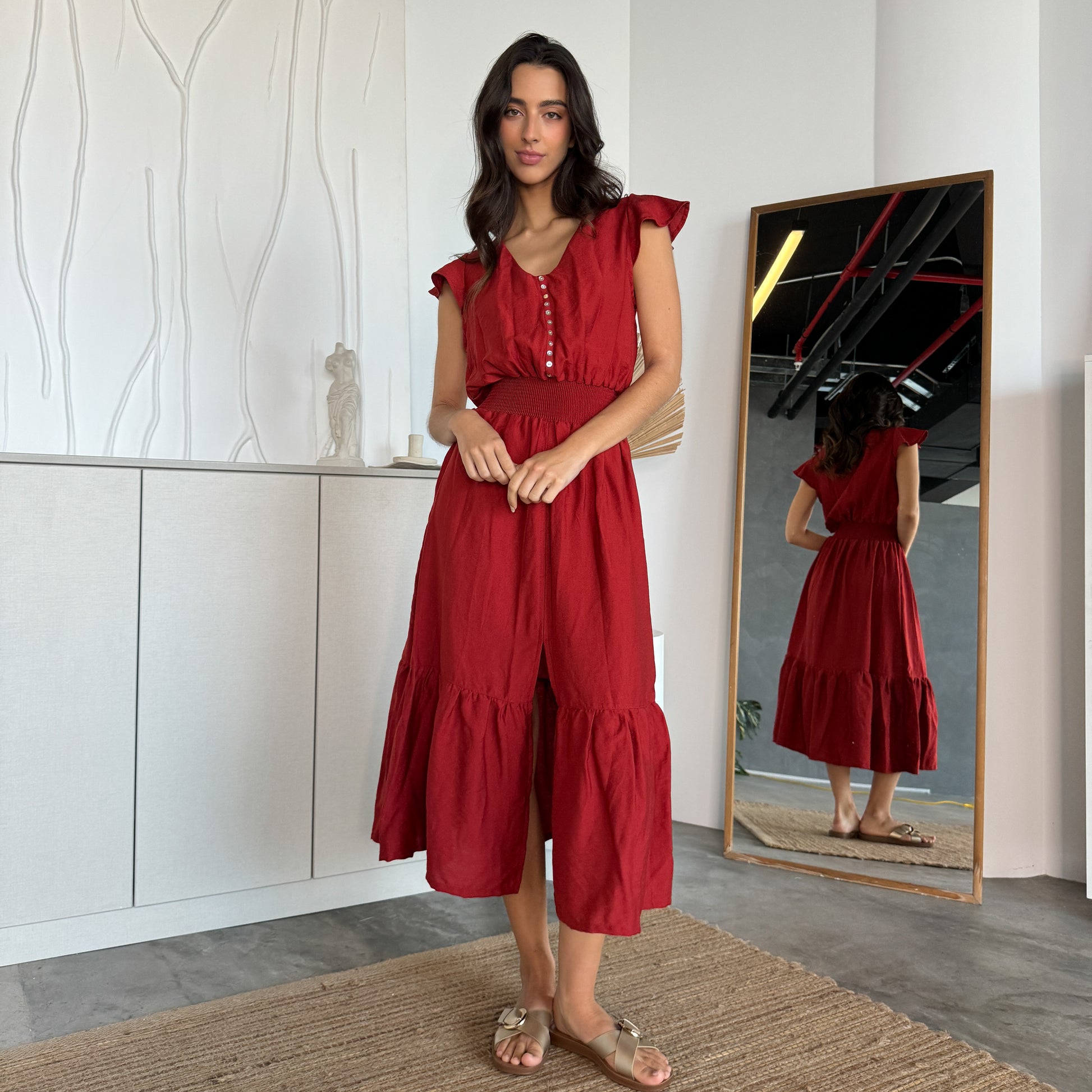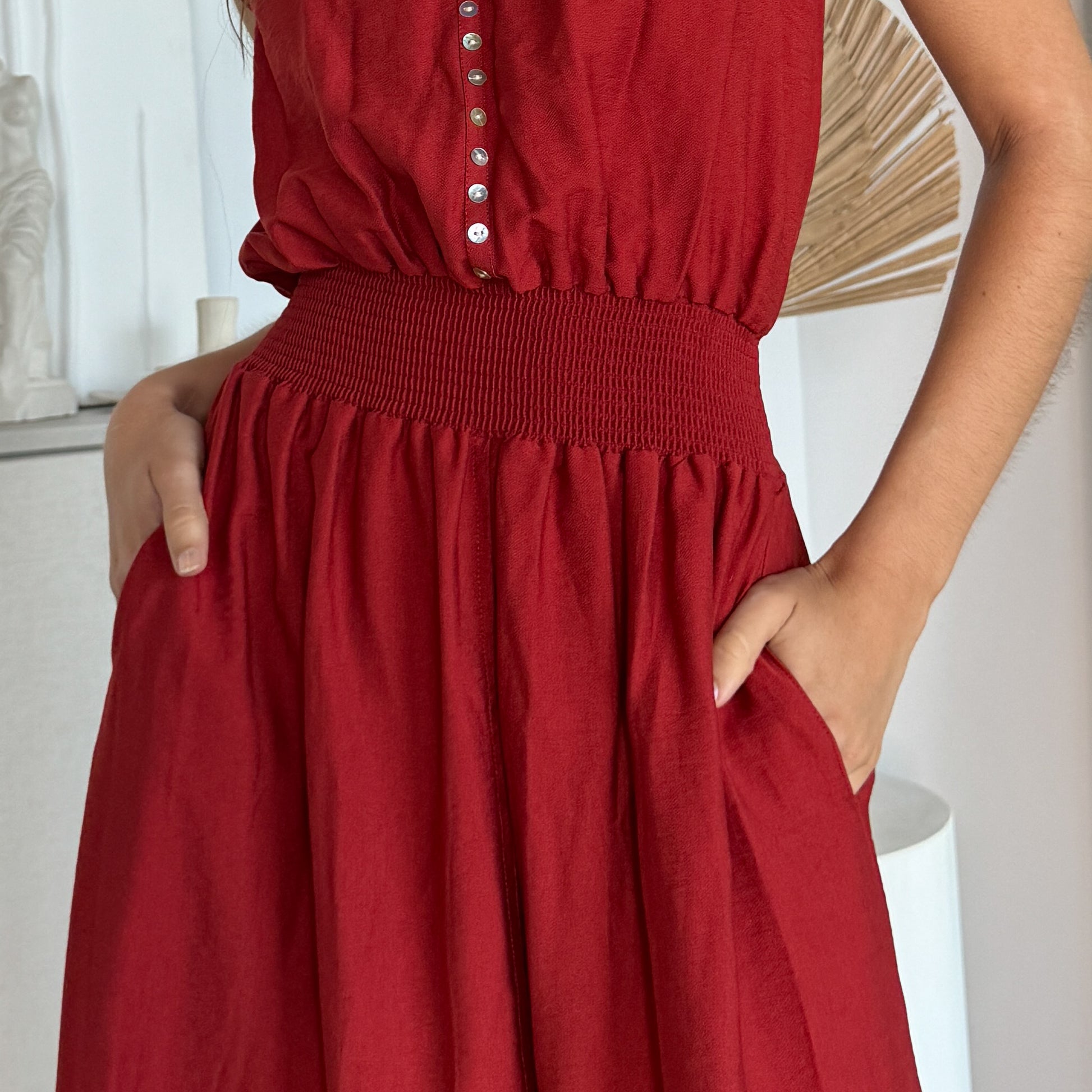 Vestido de largo midi en lino americano color terracota. Es un modelo cómodo y ligero, lleva bolsillo a los costados. La tela es efecto airflow (efecto arrugado) de tacto suave y buena caída.