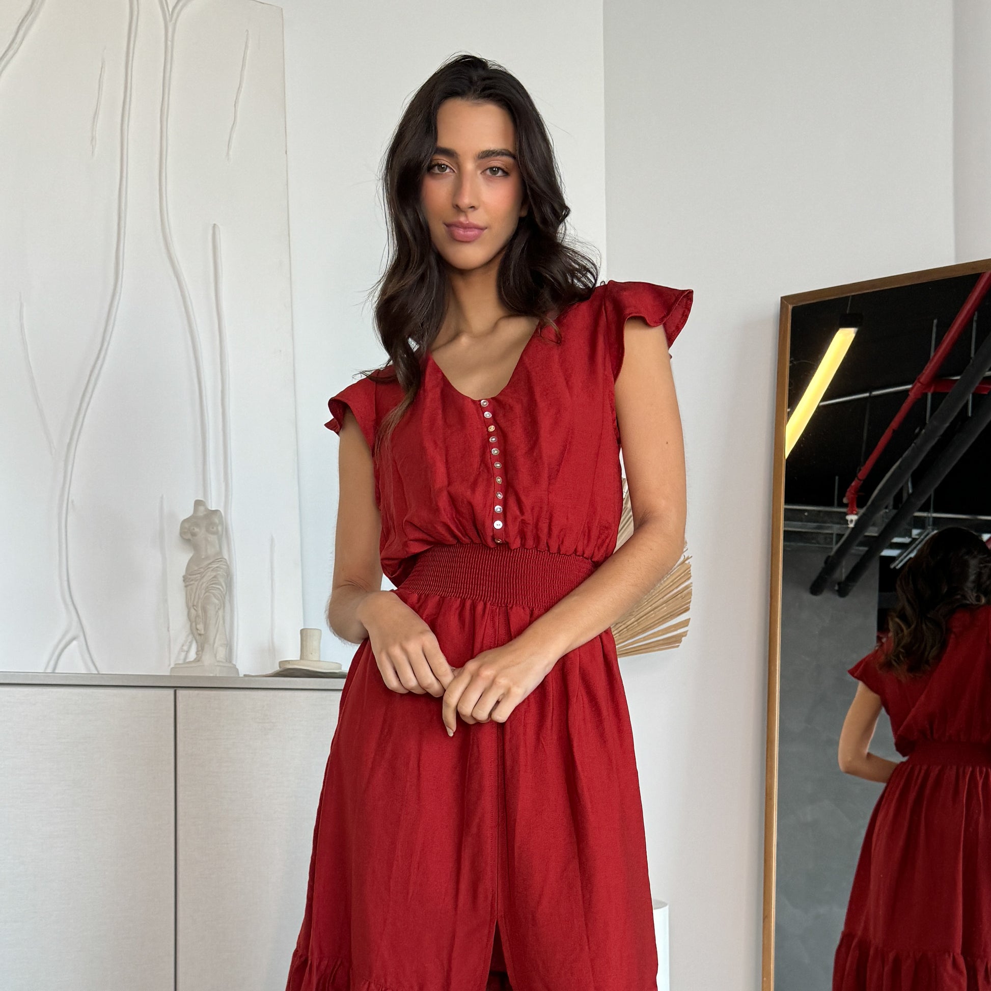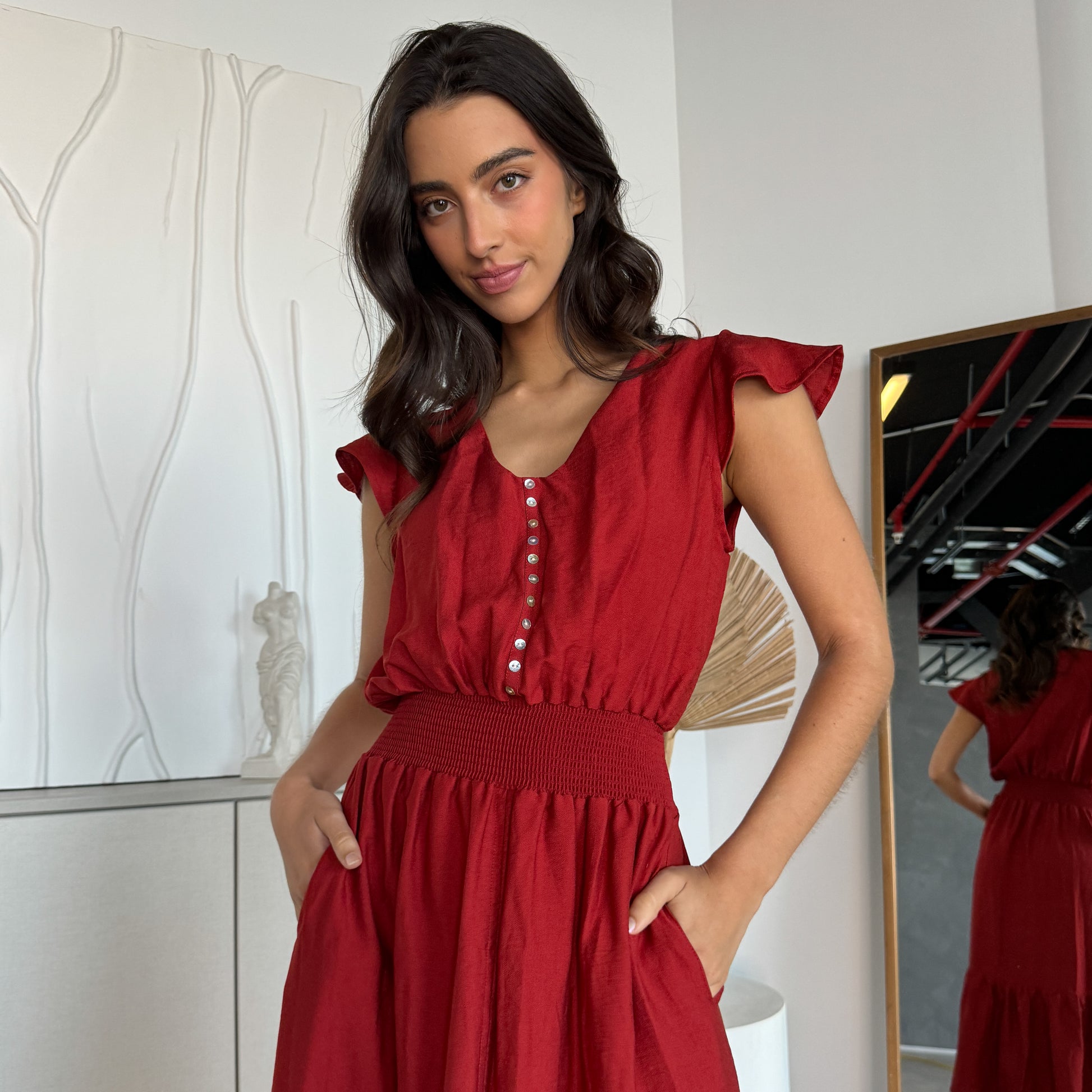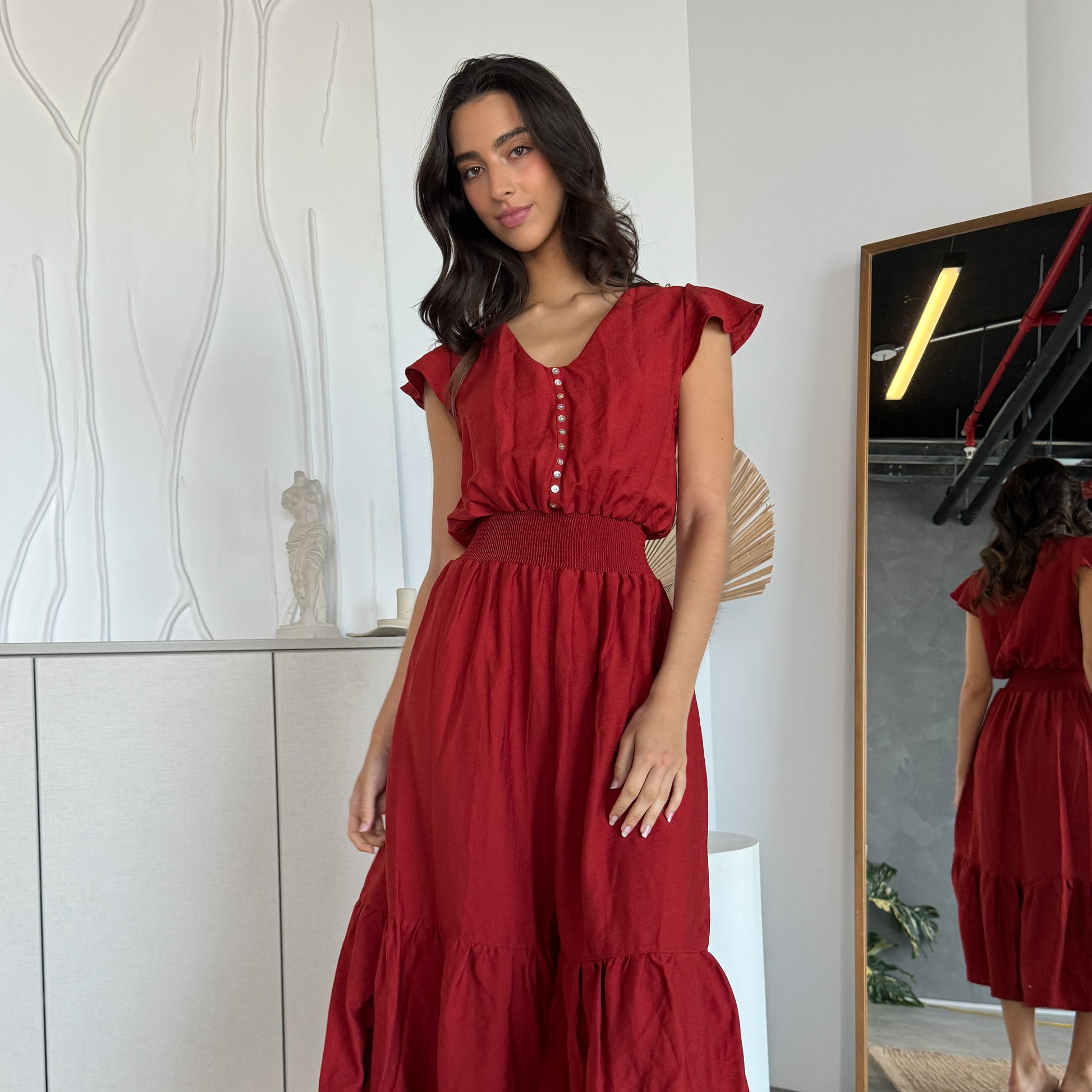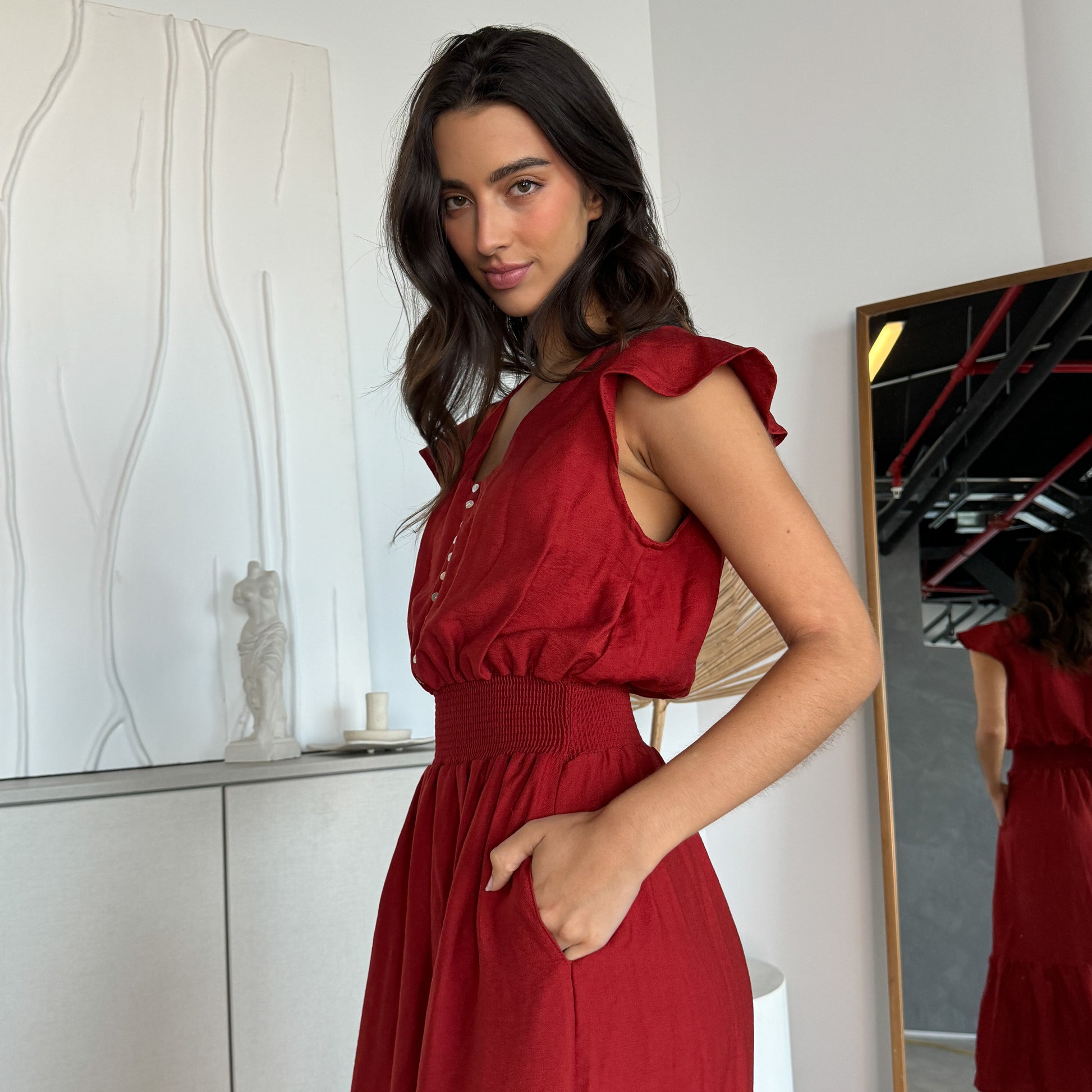 Vestido de largo midi en lino americano color terracota. Es un modelo cómodo y ligero, lleva bolsillo a los costados. La tela es efecto airflow (efecto arrugado) de tacto suave y buena caída.