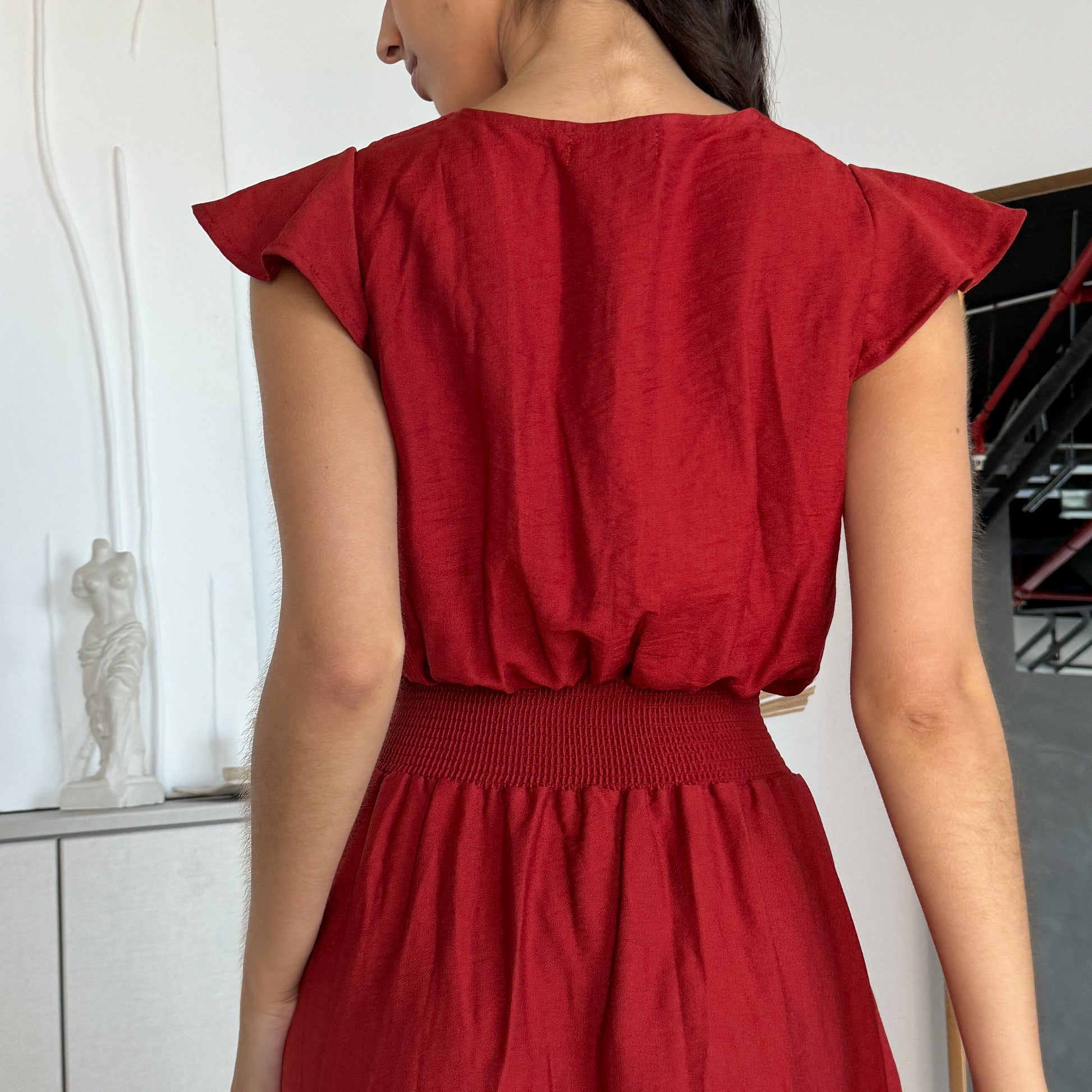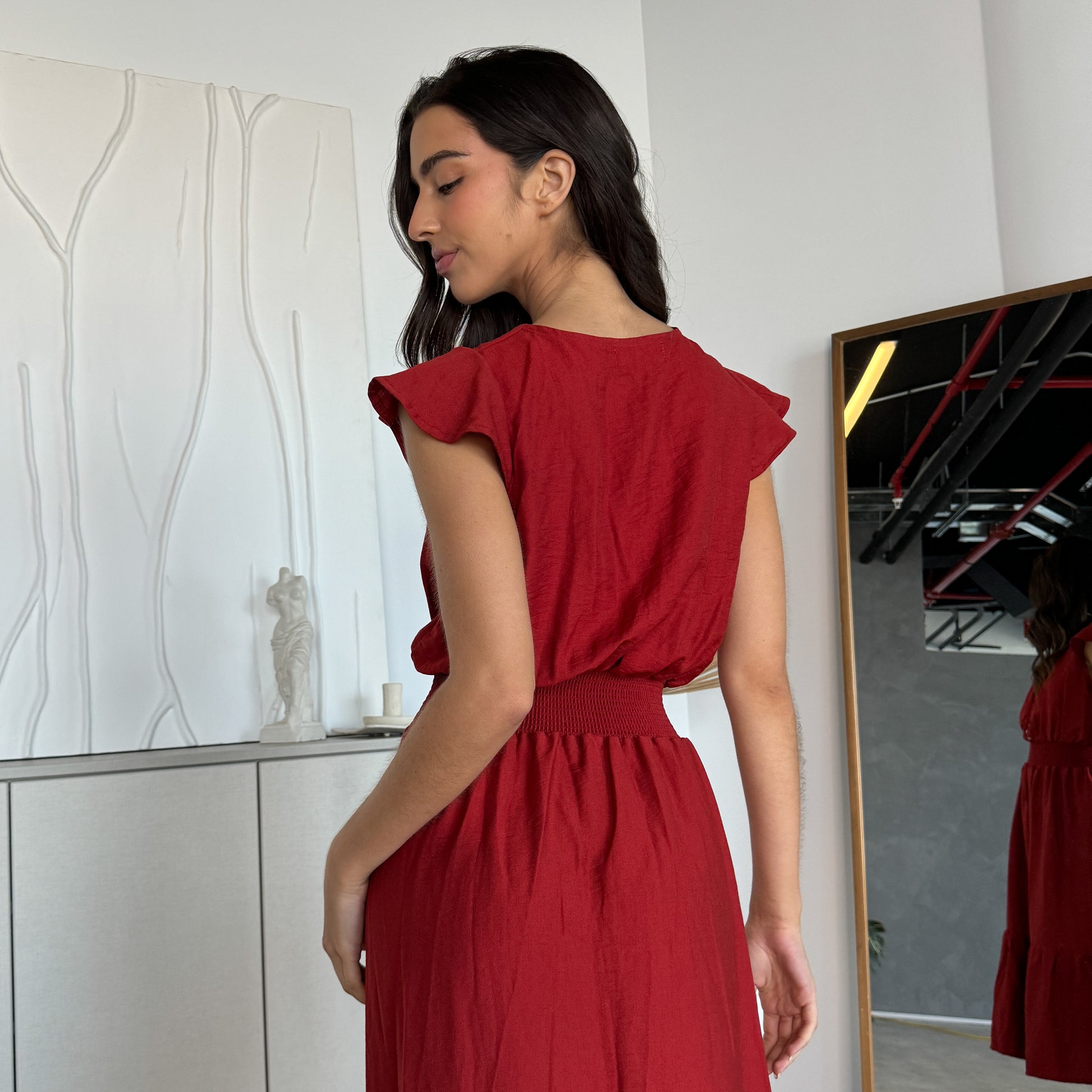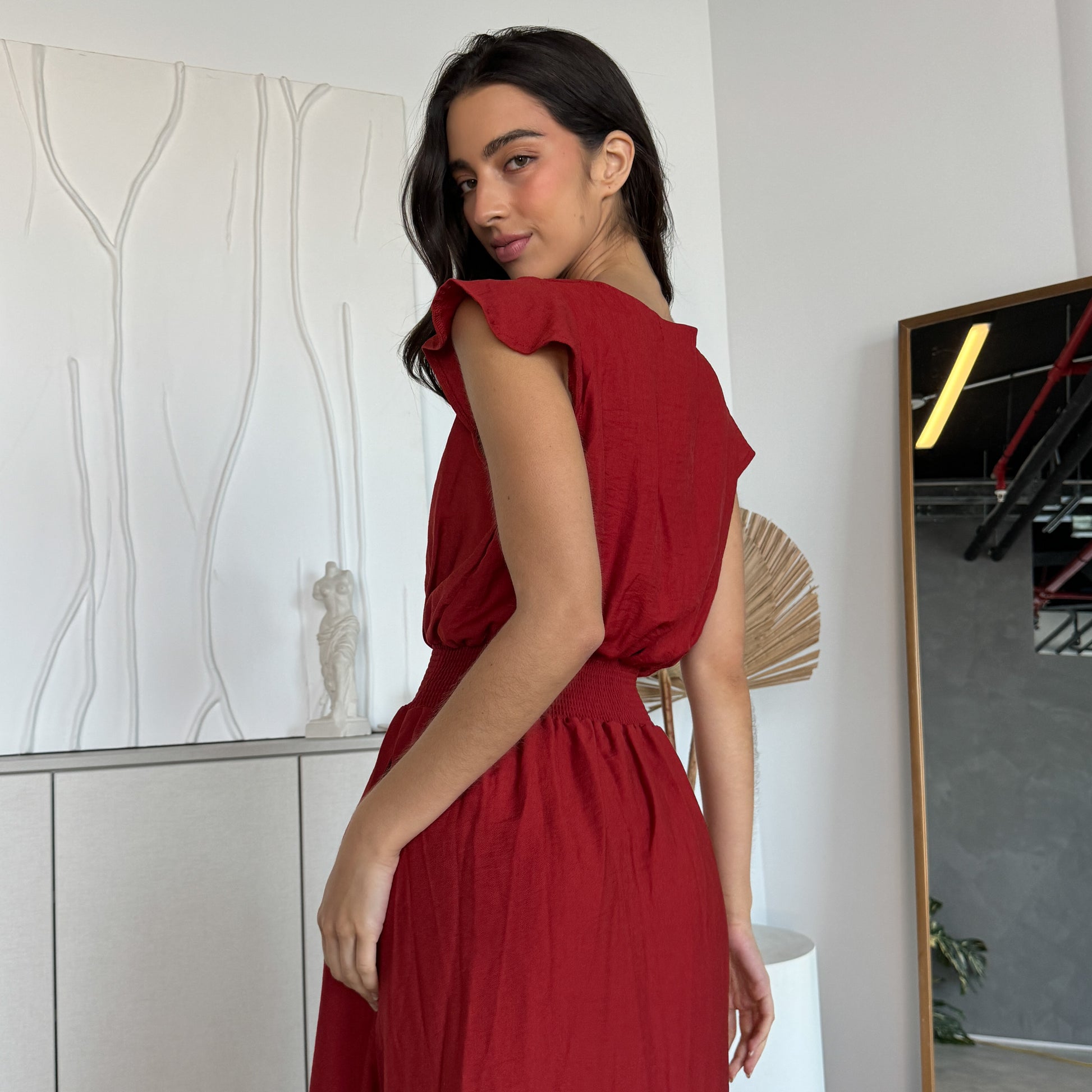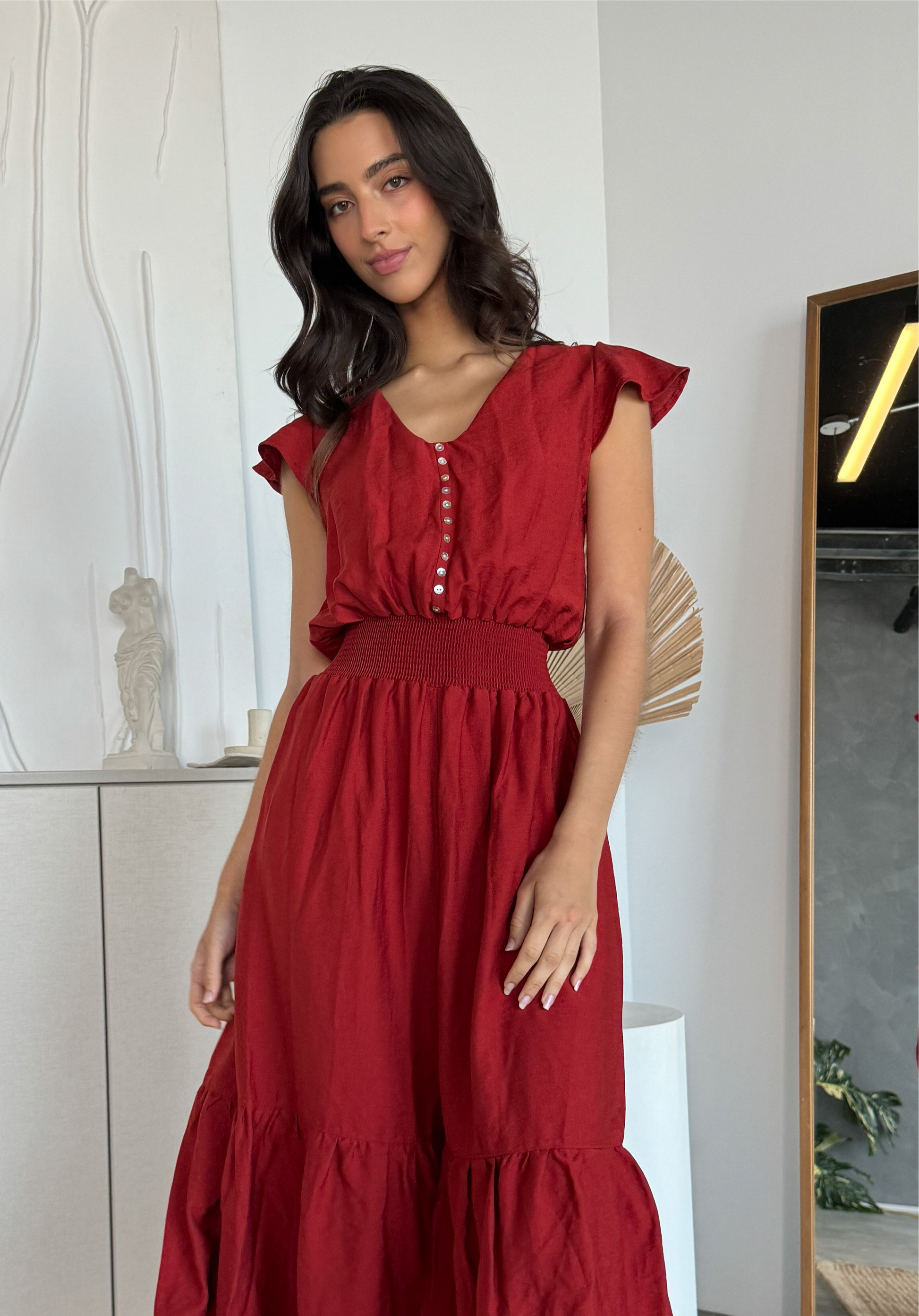 Vestido de largo midi en lino americano color terracota. Es un modelo cómodo y ligero, lleva bolsillo a los costados. La tela es efecto airflow (efecto arrugado) de tacto suave y buena caída.