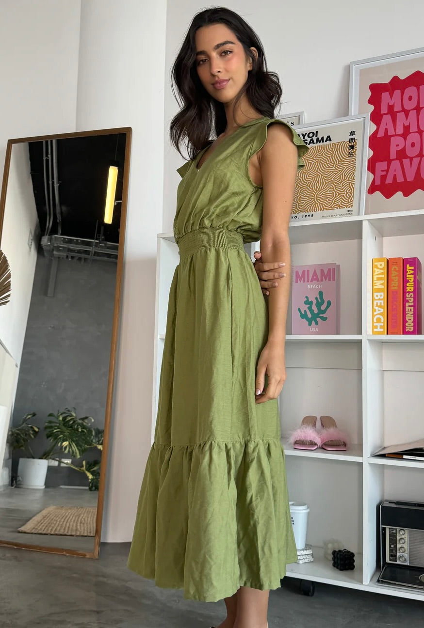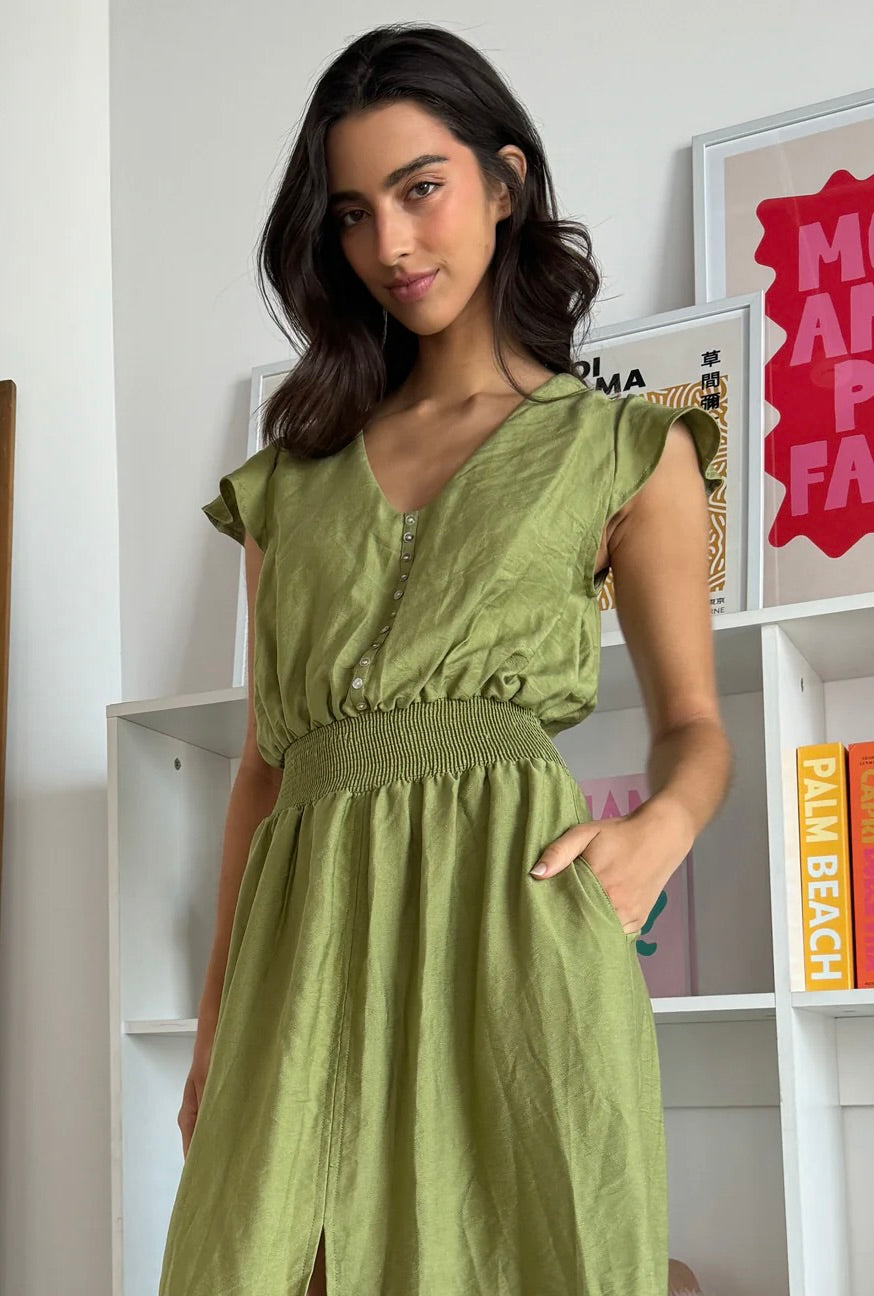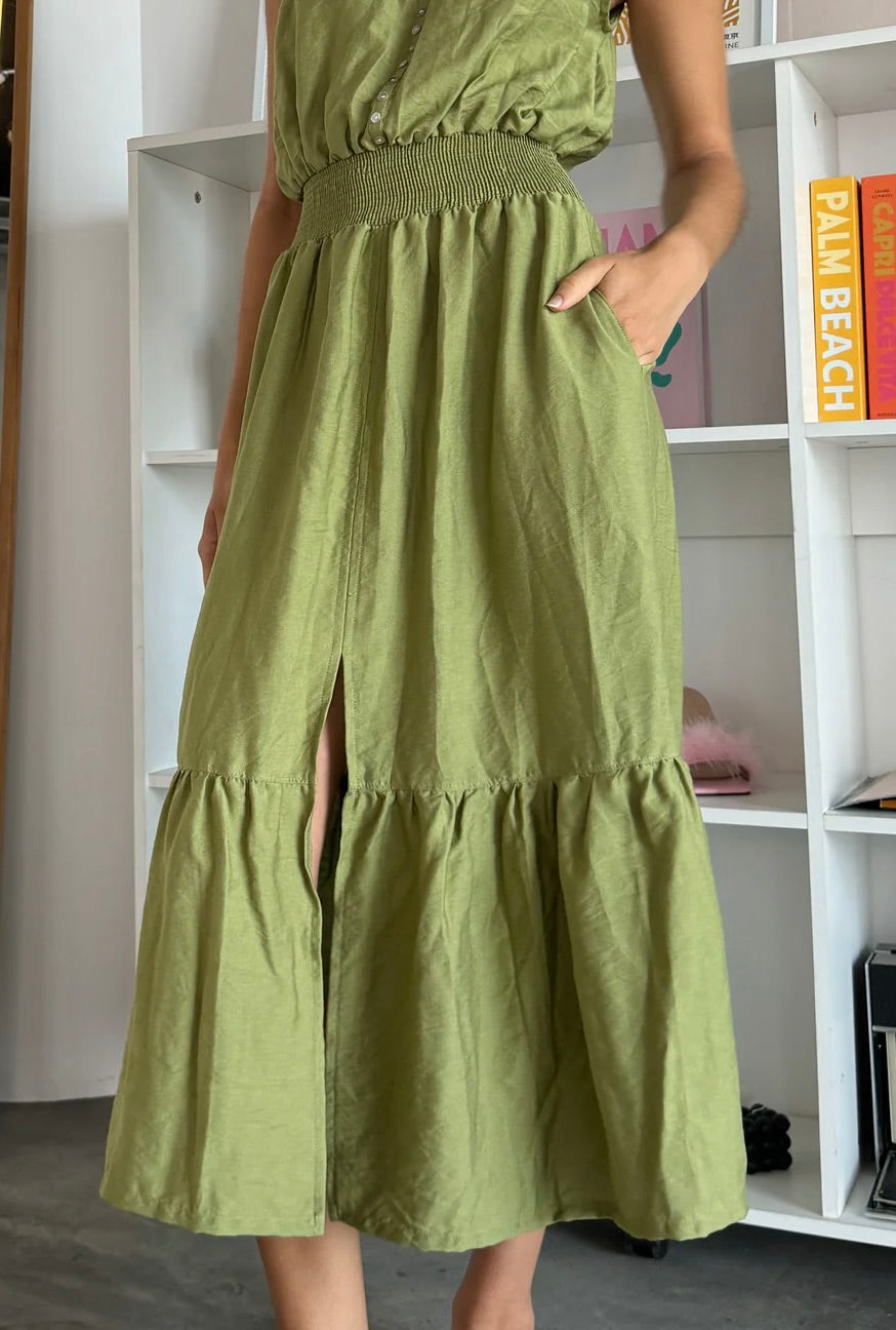 Vestido de largo midi en lino americano color verde olivo. Es un modelo cómodo y ligero, lleva bolsillo a los costados. La tela es efecto airflow (efecto arrugado) de tacto suave y buena caída.