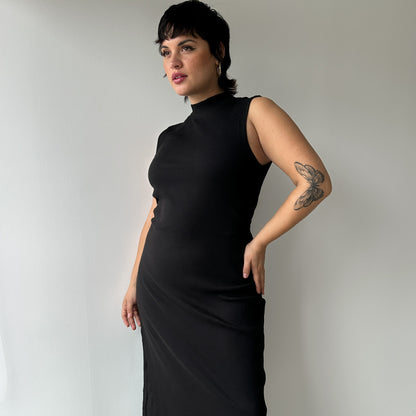 Nuestro vestido Luciana negro cuenta con cuello tipo halter para amarrar lazada en la espalda (con abertura). Lleva un corte con elástico en la cintura posterior para resaltar la cintura y la curva de la espalda con la cadera. Manga cero, modelo ligeramente suelto y largo midi.